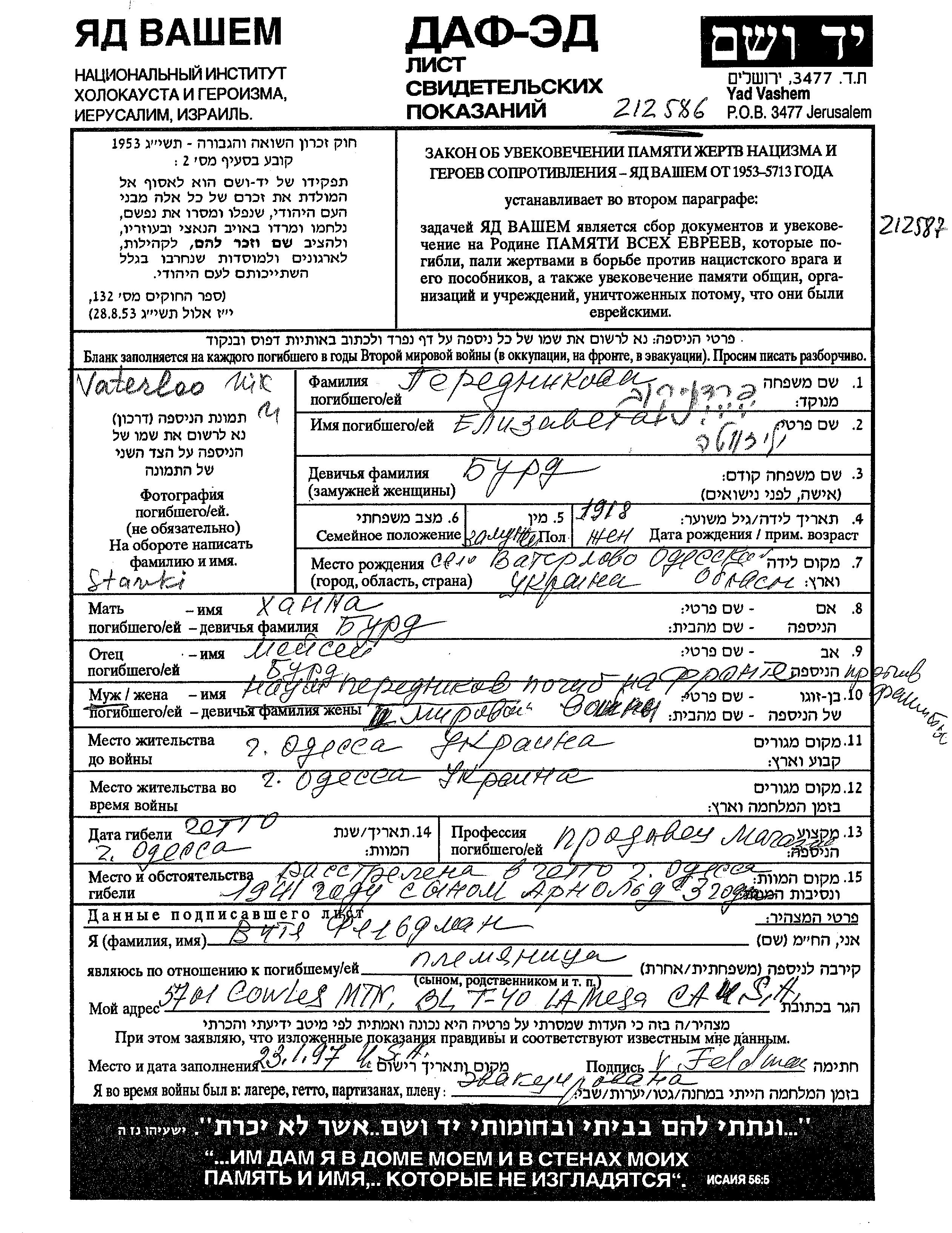 Передникова Арнольд Одесса, Украина (СССР) Лист свидетельских показаний