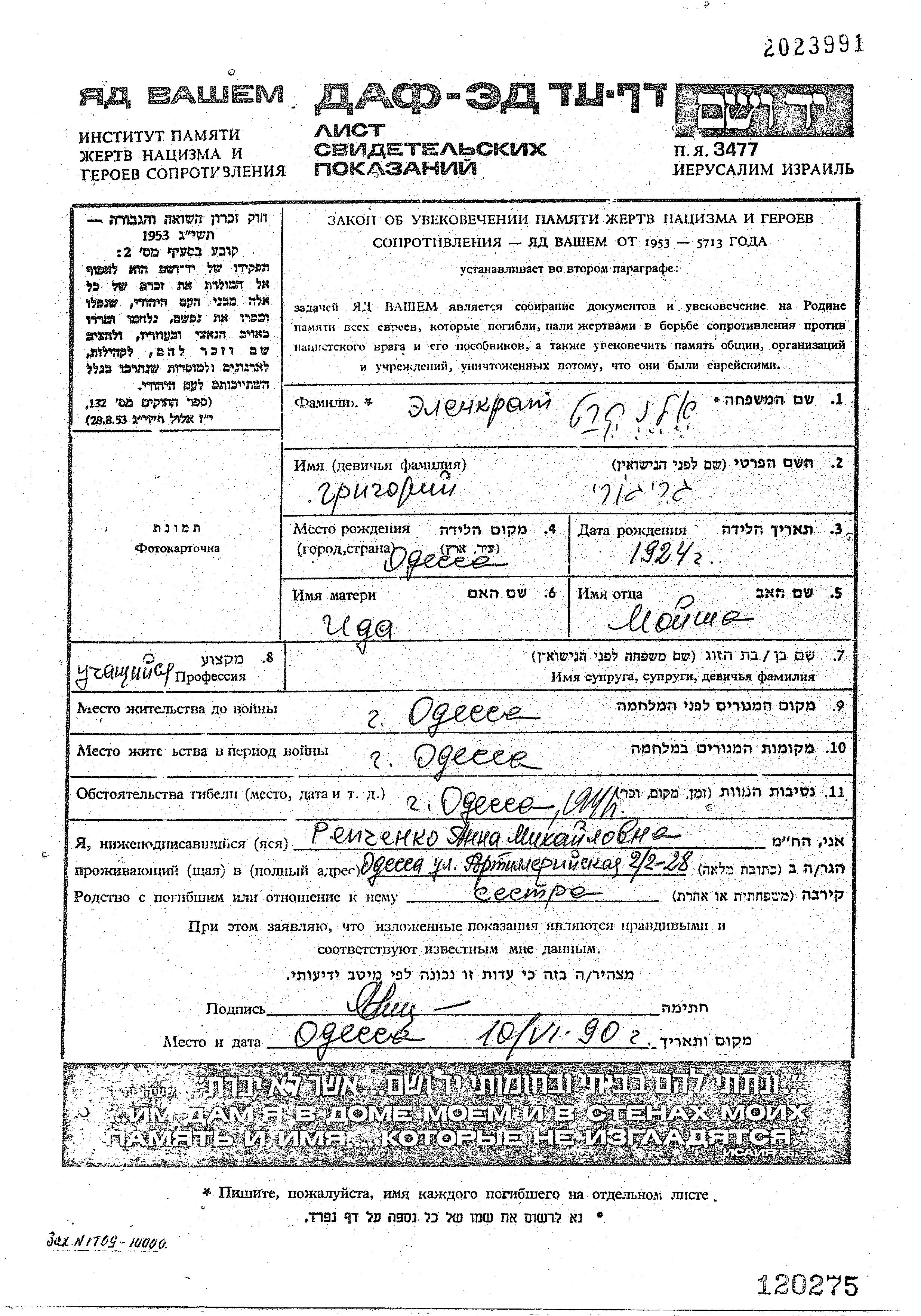 Эленкрат | Григорий | 1924 | Одесса, Украина (СССР) | Лист свидетельских показаний |