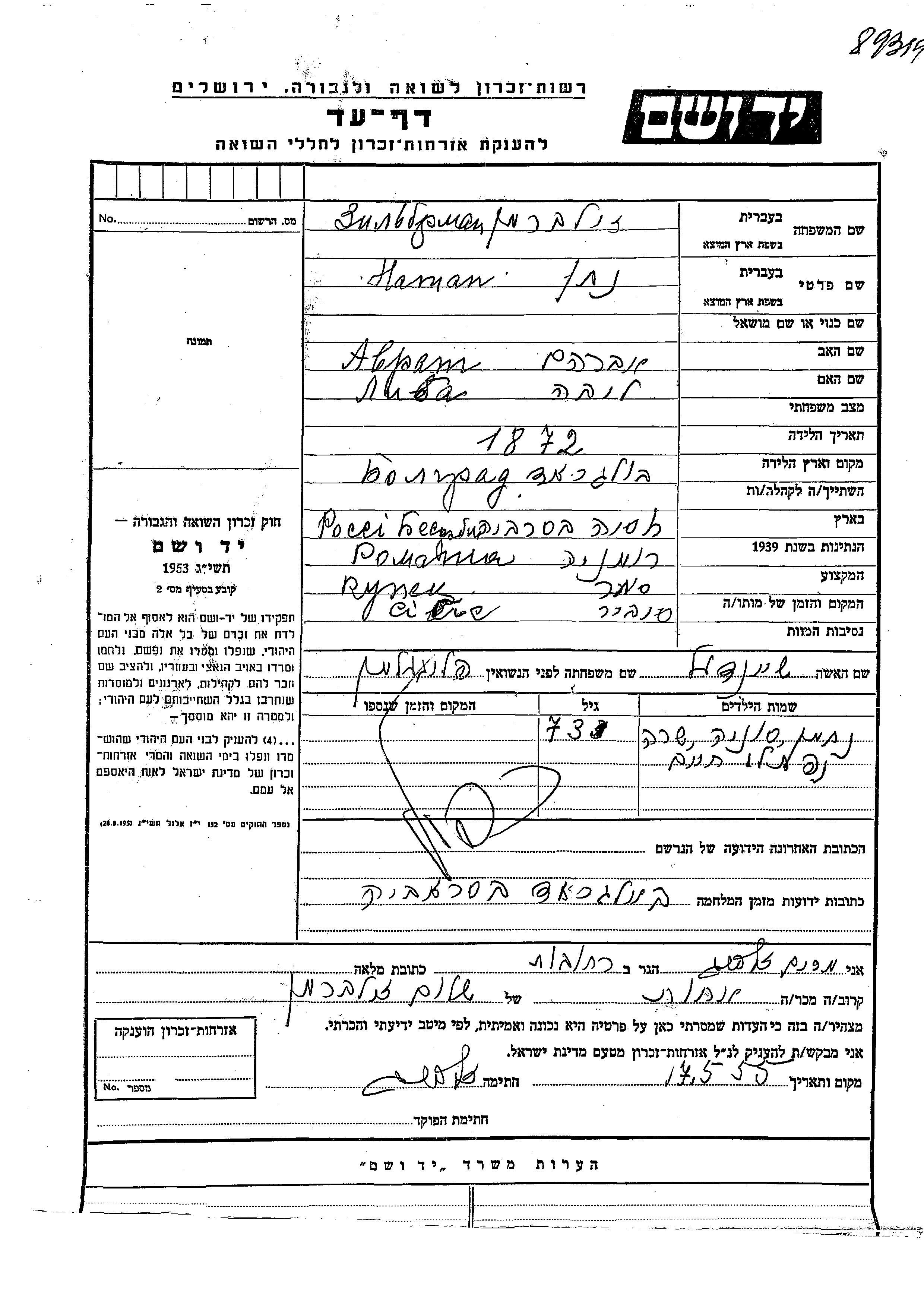 Натан Зильберман, место рождения: Болград, Румыния. Торговец / торговка. Место жительства до войны: Болград, Румыния.