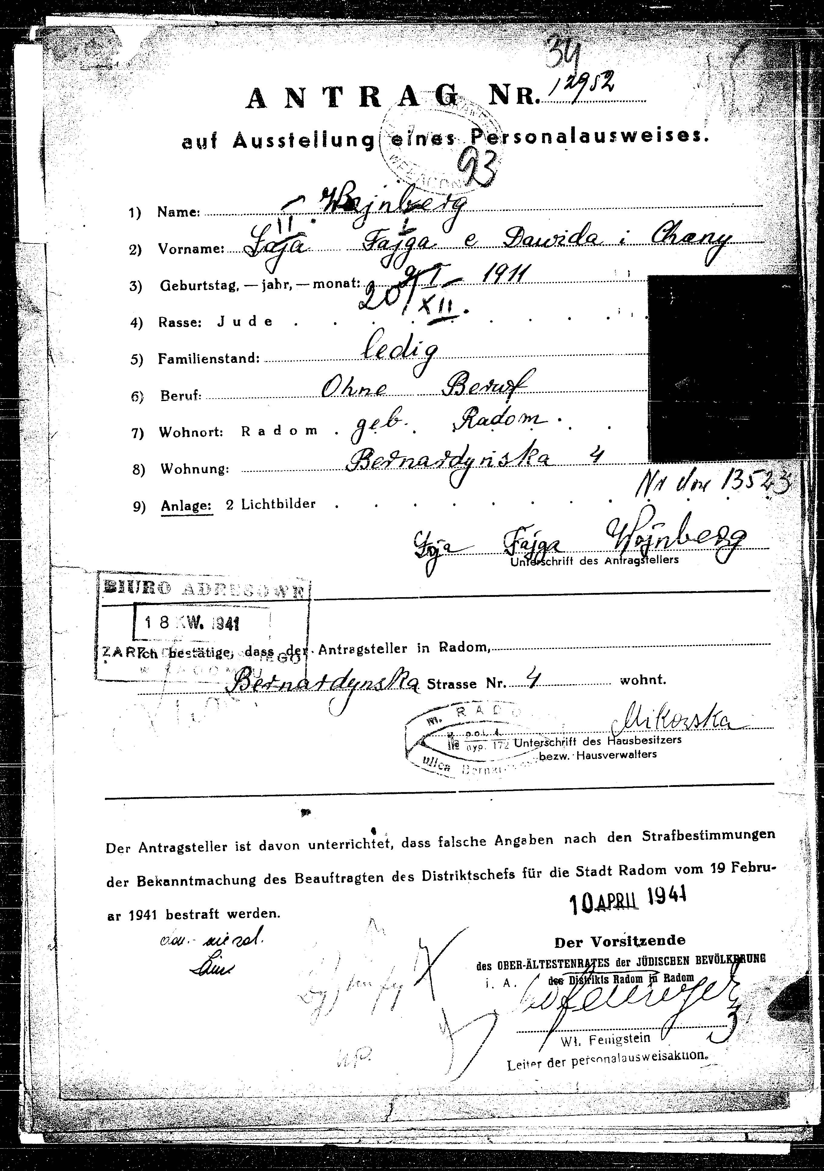 Фейга Лая Вайнберг, место рождения: Радом, Польша. Без профессии. Место жительства до войны: Радом, Польша.
