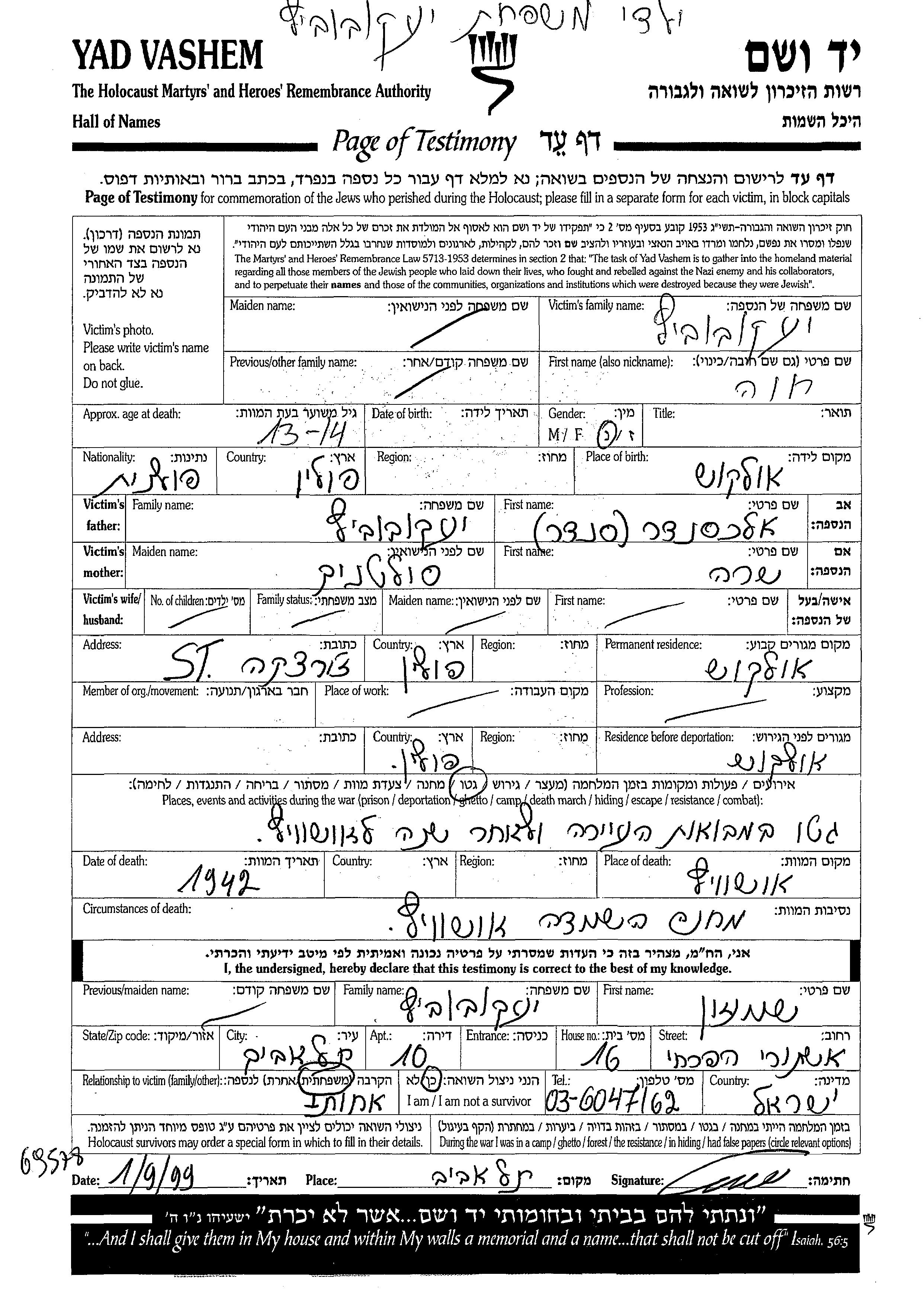 Якубовиц | Хава | Олькуш, Польша | Лист свидетельских показаний | |