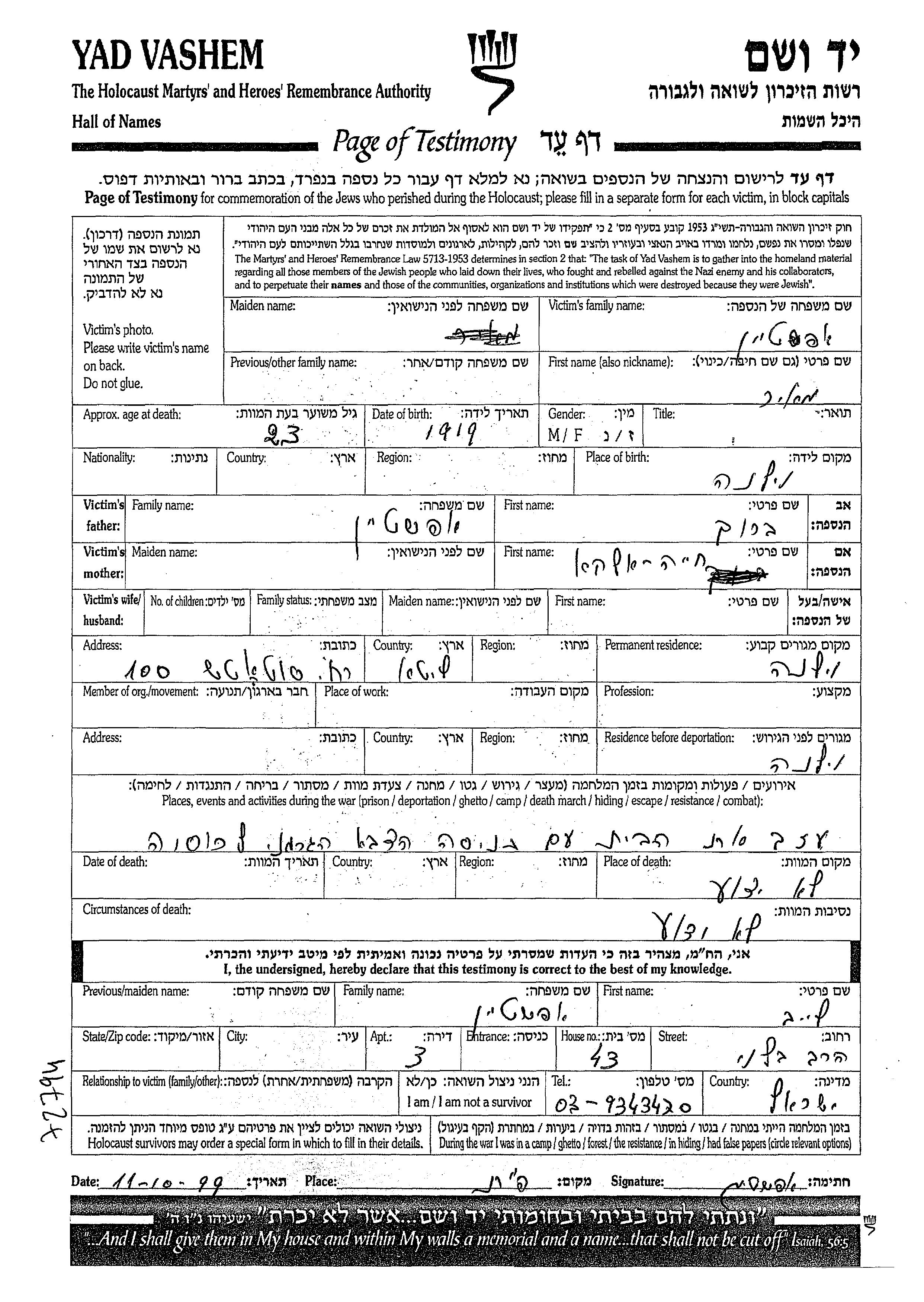 Эпштейн | Меир | 1919 | Вильно, Польша | Лист свидетельских показаний |