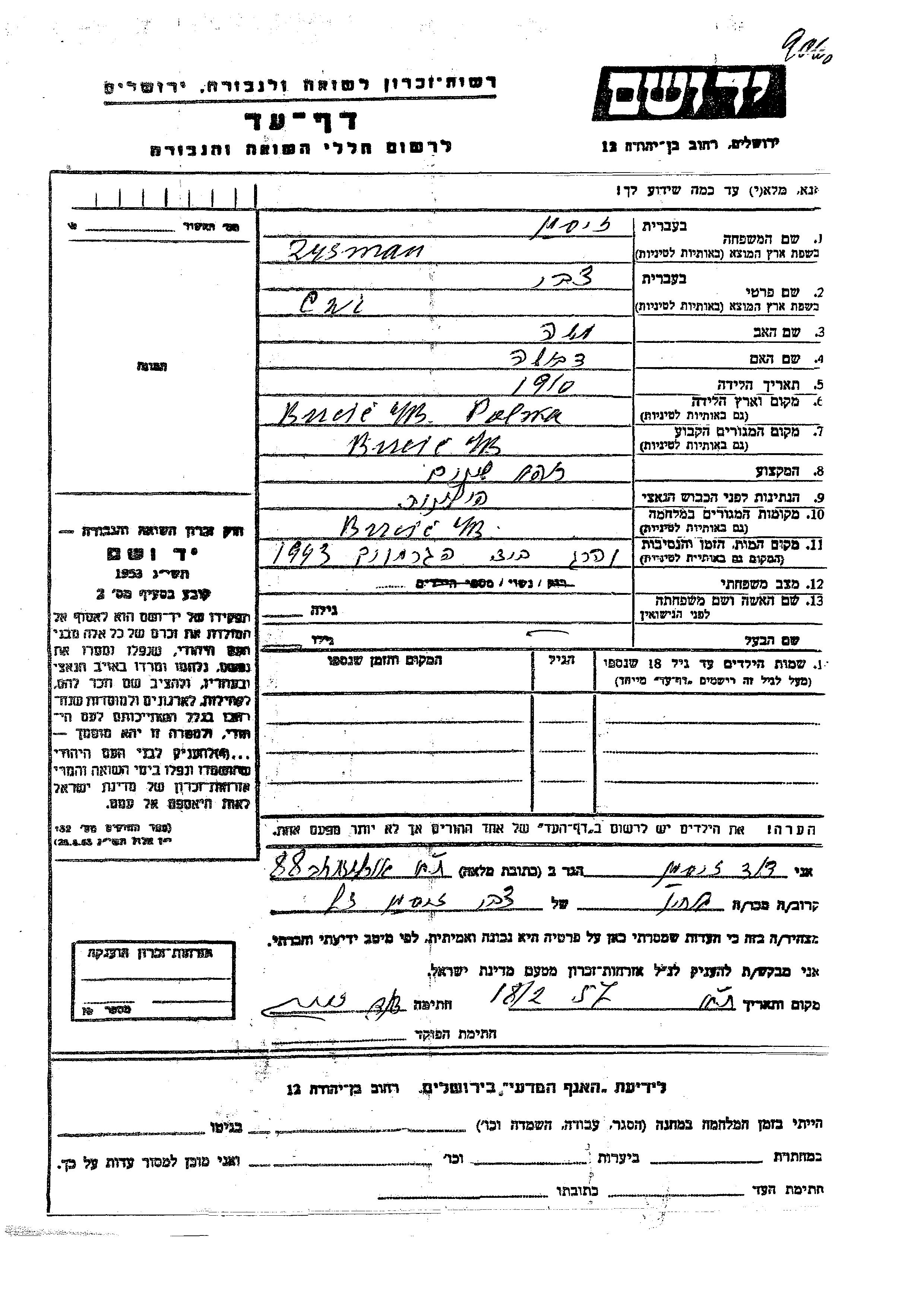Зысман Цви 1910 Брест Над Бугом, Польша Лист свидетельских показаний