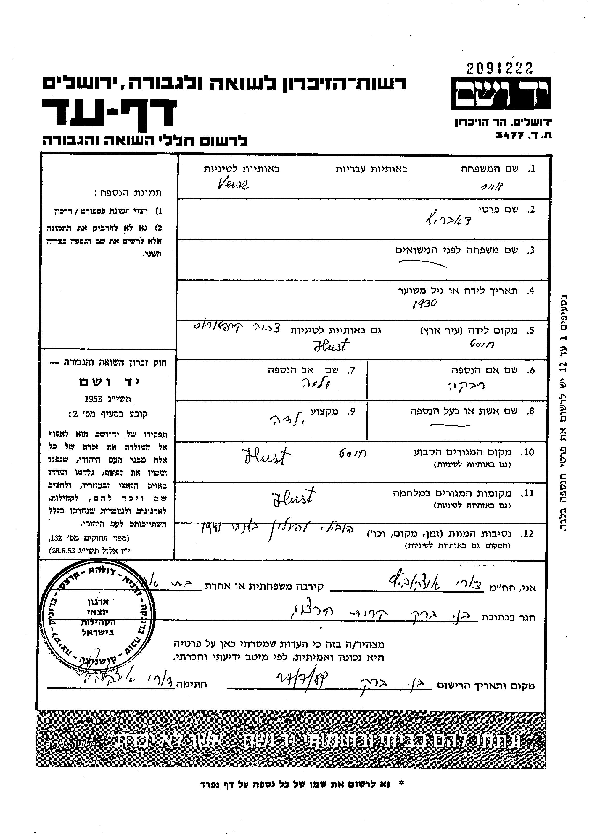 Яд Вашем - Листы свидетельских показаний Мемориального фонда