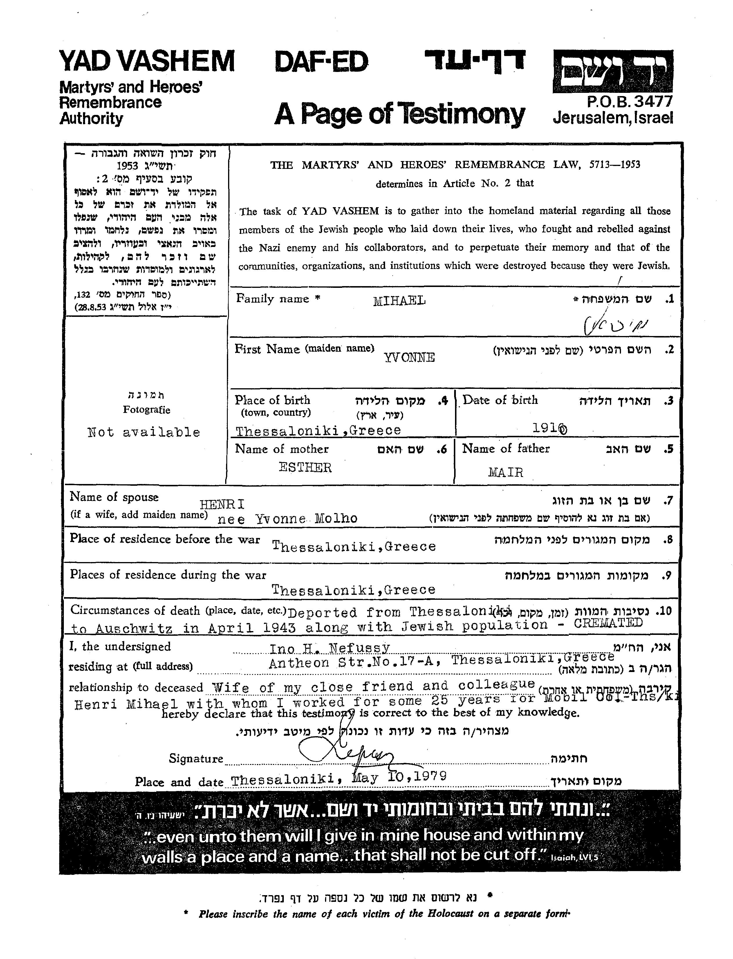 | Михаэль | Ивон | 1910 | Салоники, Греция | Лист свидетельских показаний |