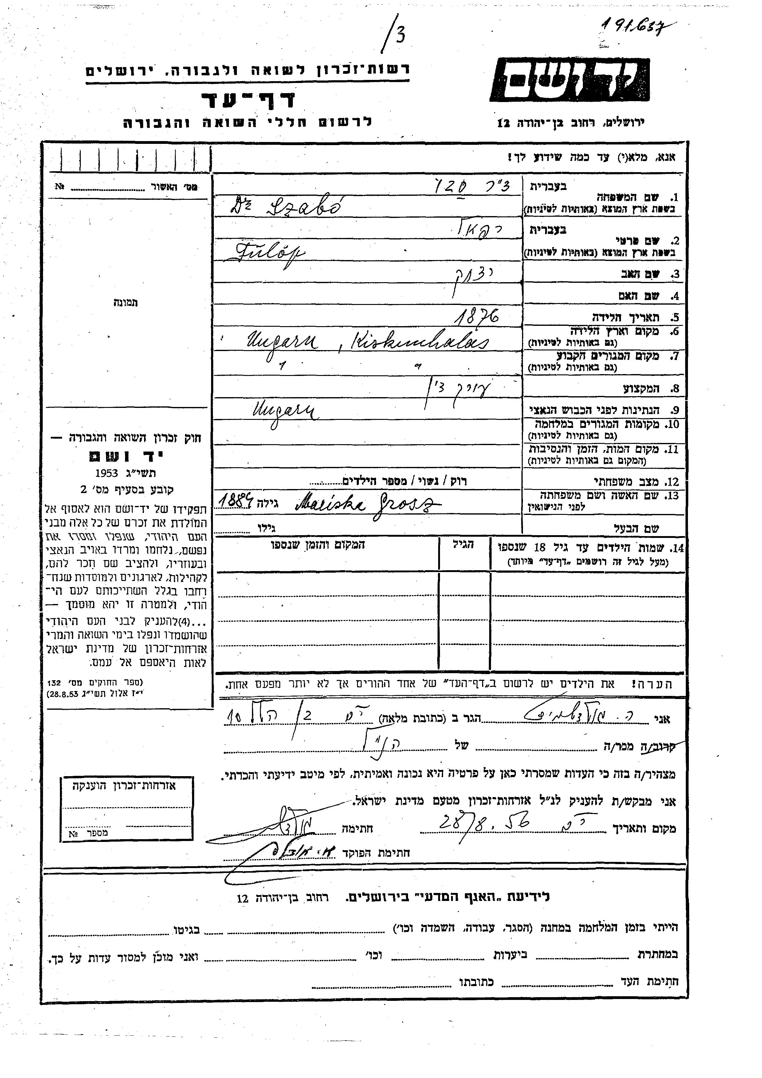Яд Вашем - Листы свидетельских показаний Мемориального фонда