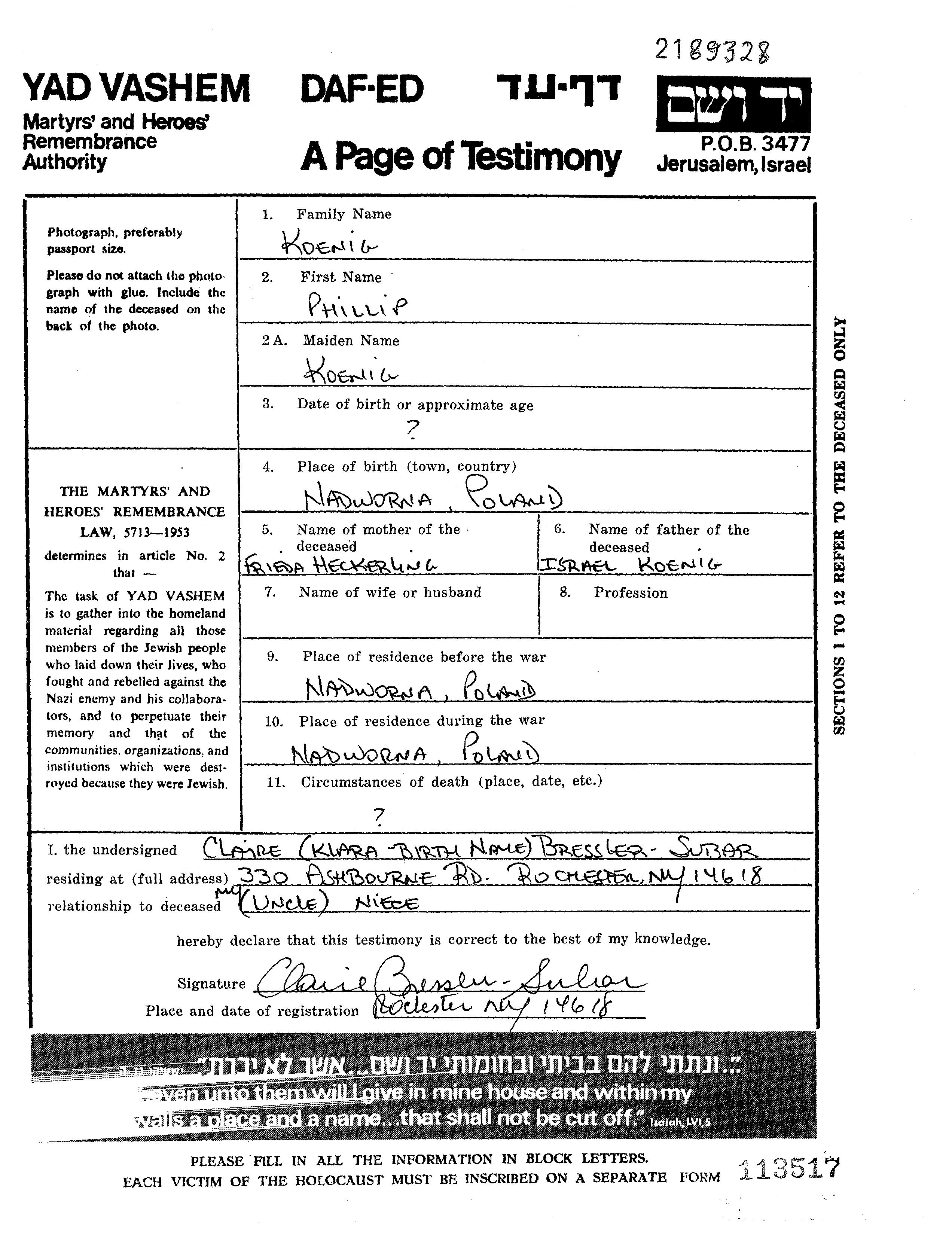 Филлип Кёниг, место рождения: Надворная, Польша. Место жительства до войны: Надворная, Польша.