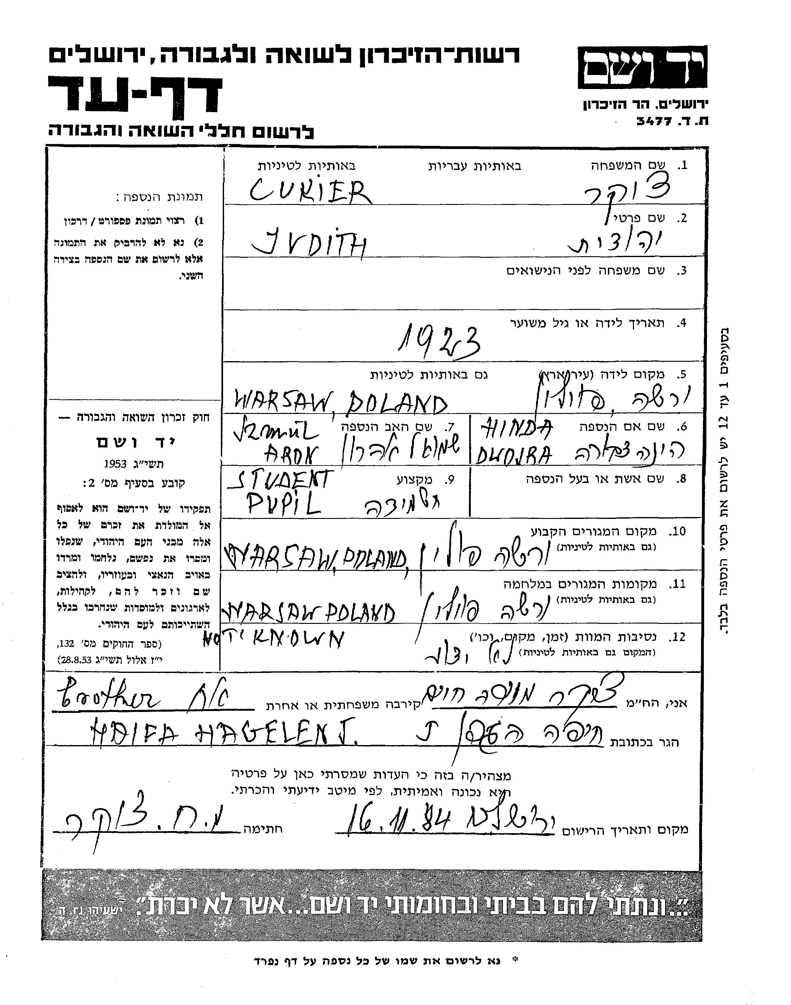 Цукер Иегудит Варшава, Польша Лист свидетельских показаний