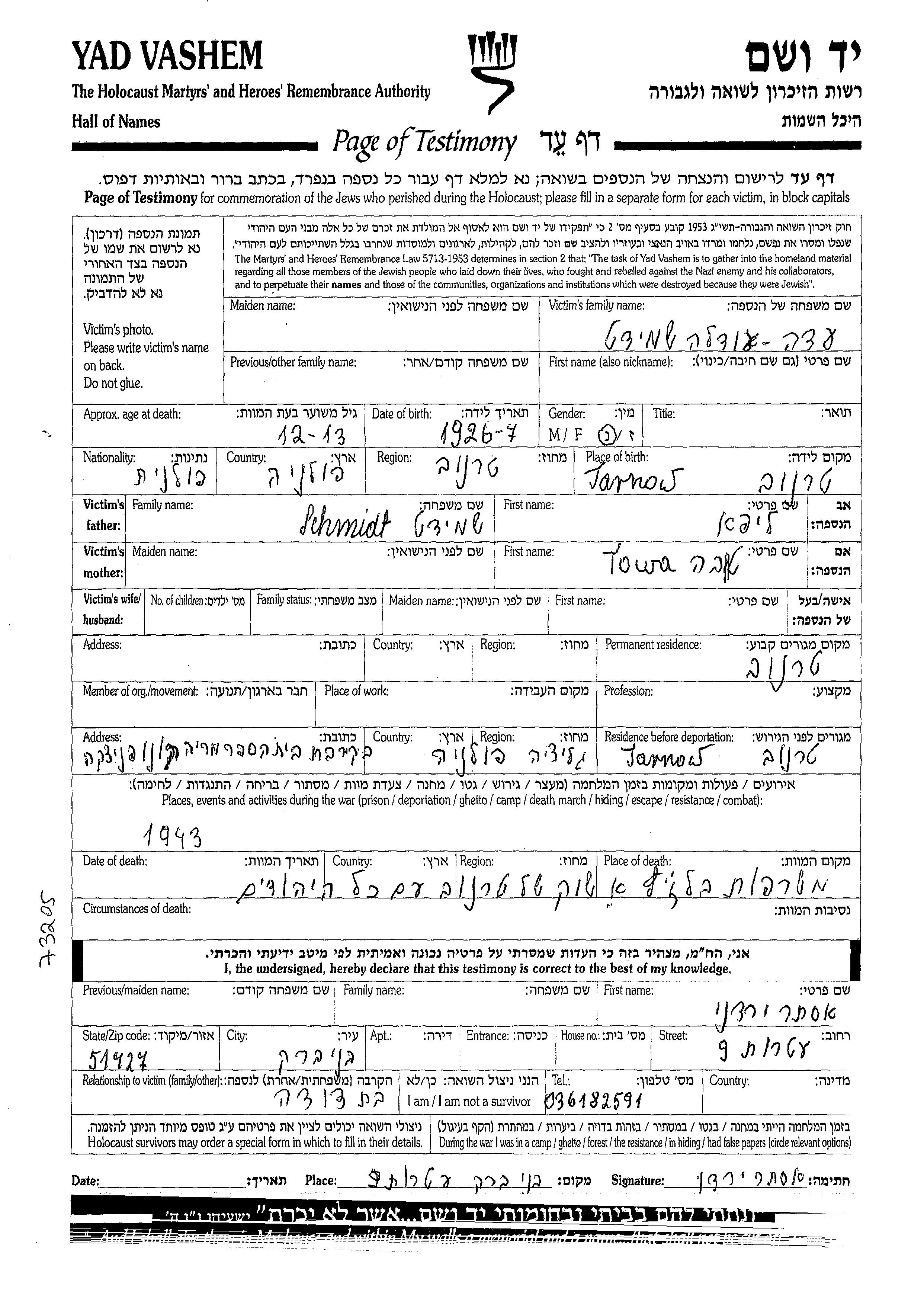 Шмидт | Ада | Тарнув, Польша | Лист свидетельских показаний |