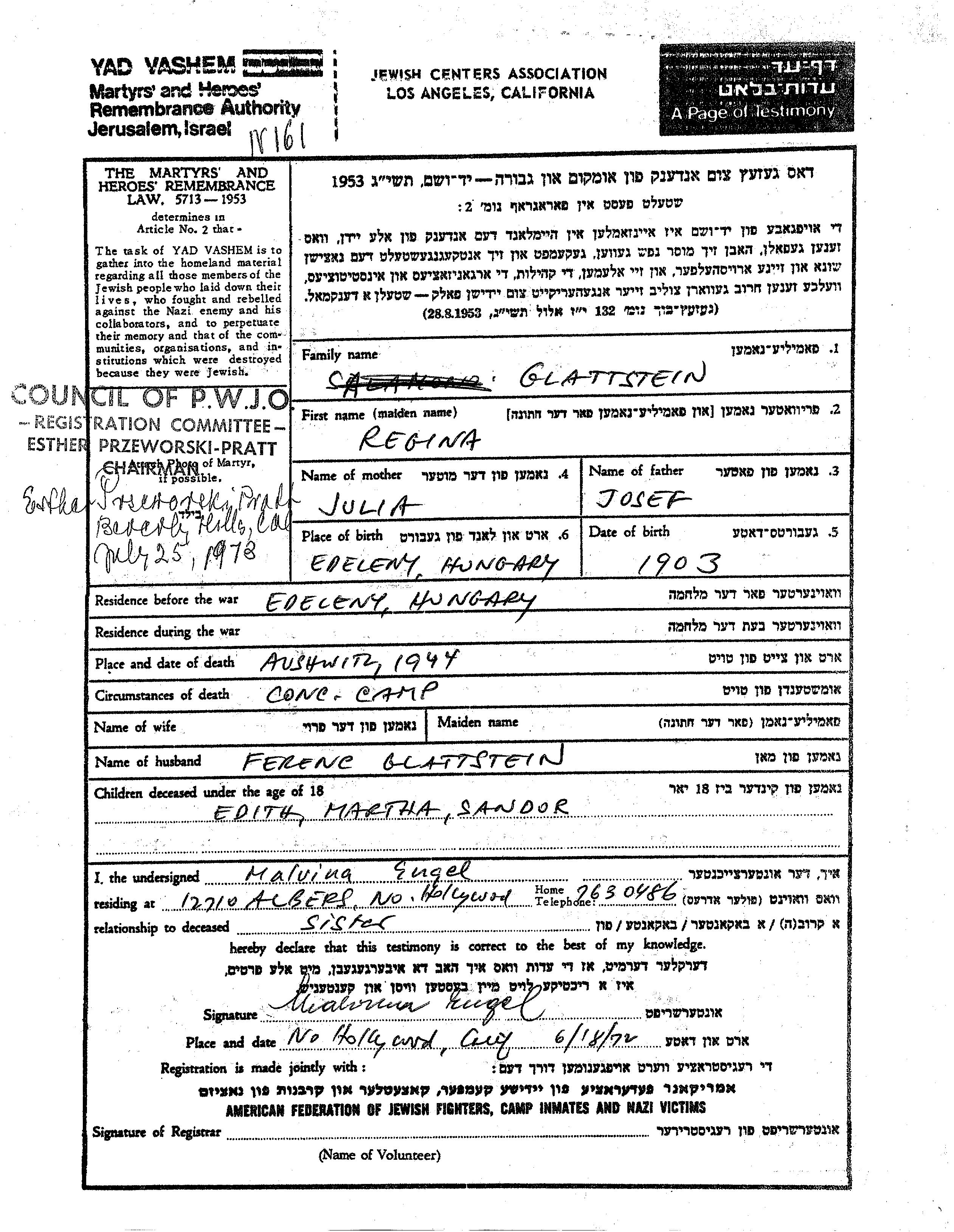 Глаттштайн Сандор Эделень, Венгрия Лист свидетельских показаний