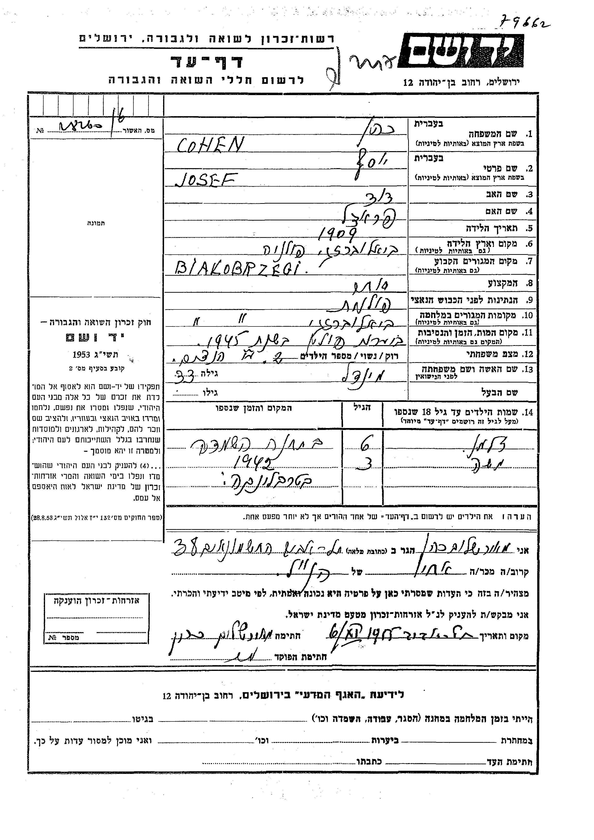 Залман Коэн. Место жительства до войны: Бялобжеги, Польша.