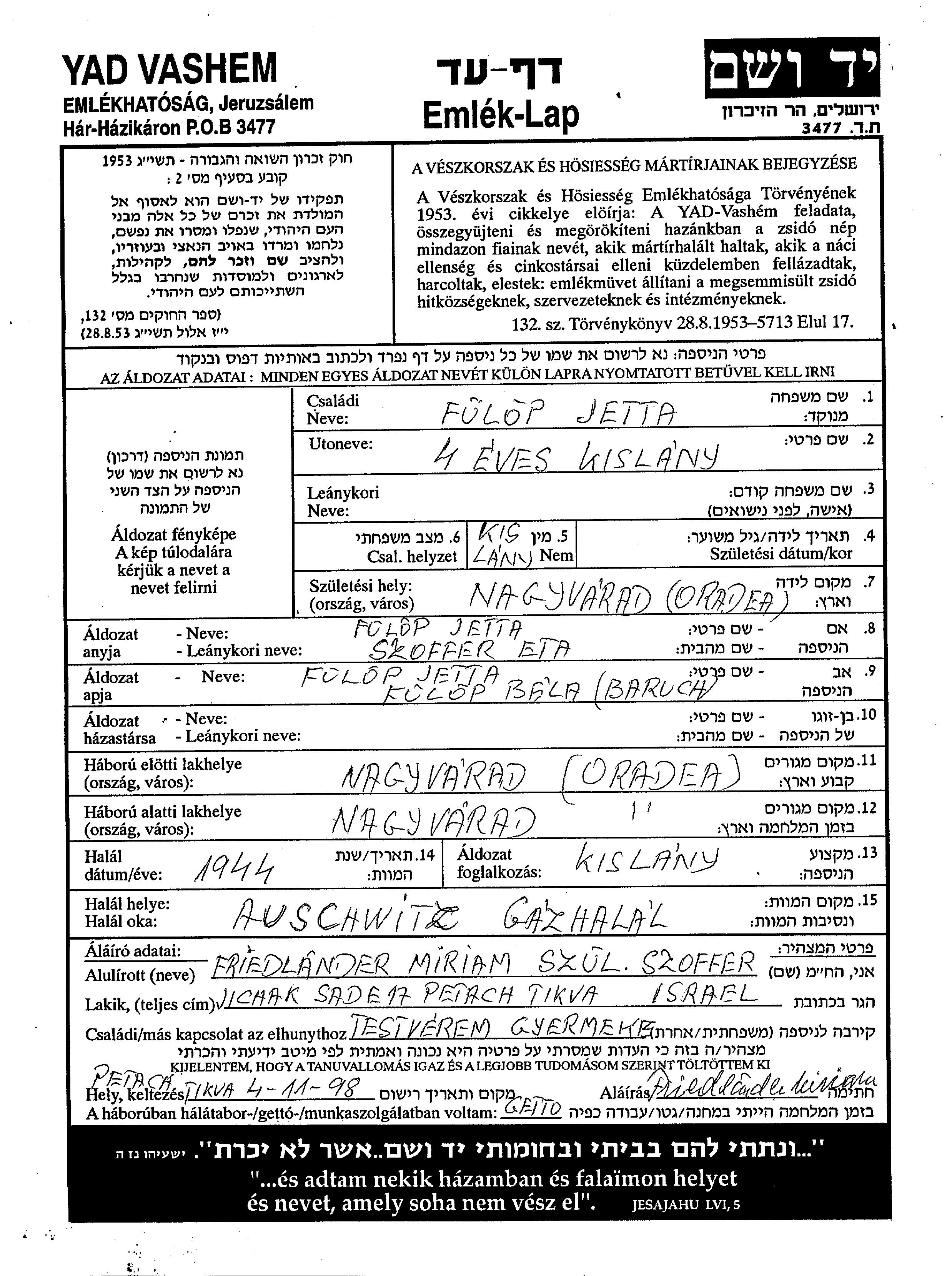 | Фулоп | Етта | Надьварад, Румыния | Лист свидетельских показаний | |