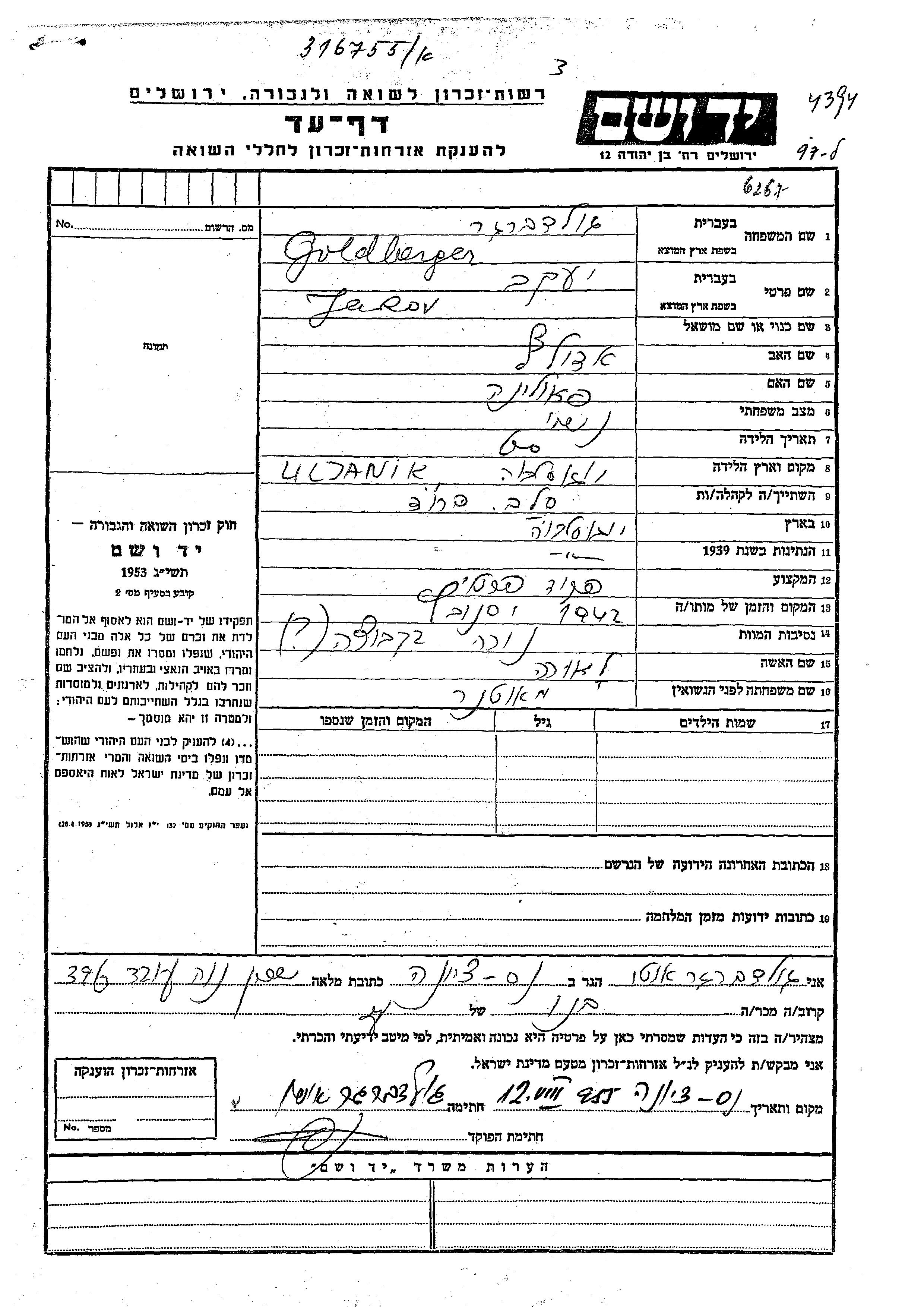 Гольдбергер Яков Славонский-Брод, Югославия Лист свидетельских показаний