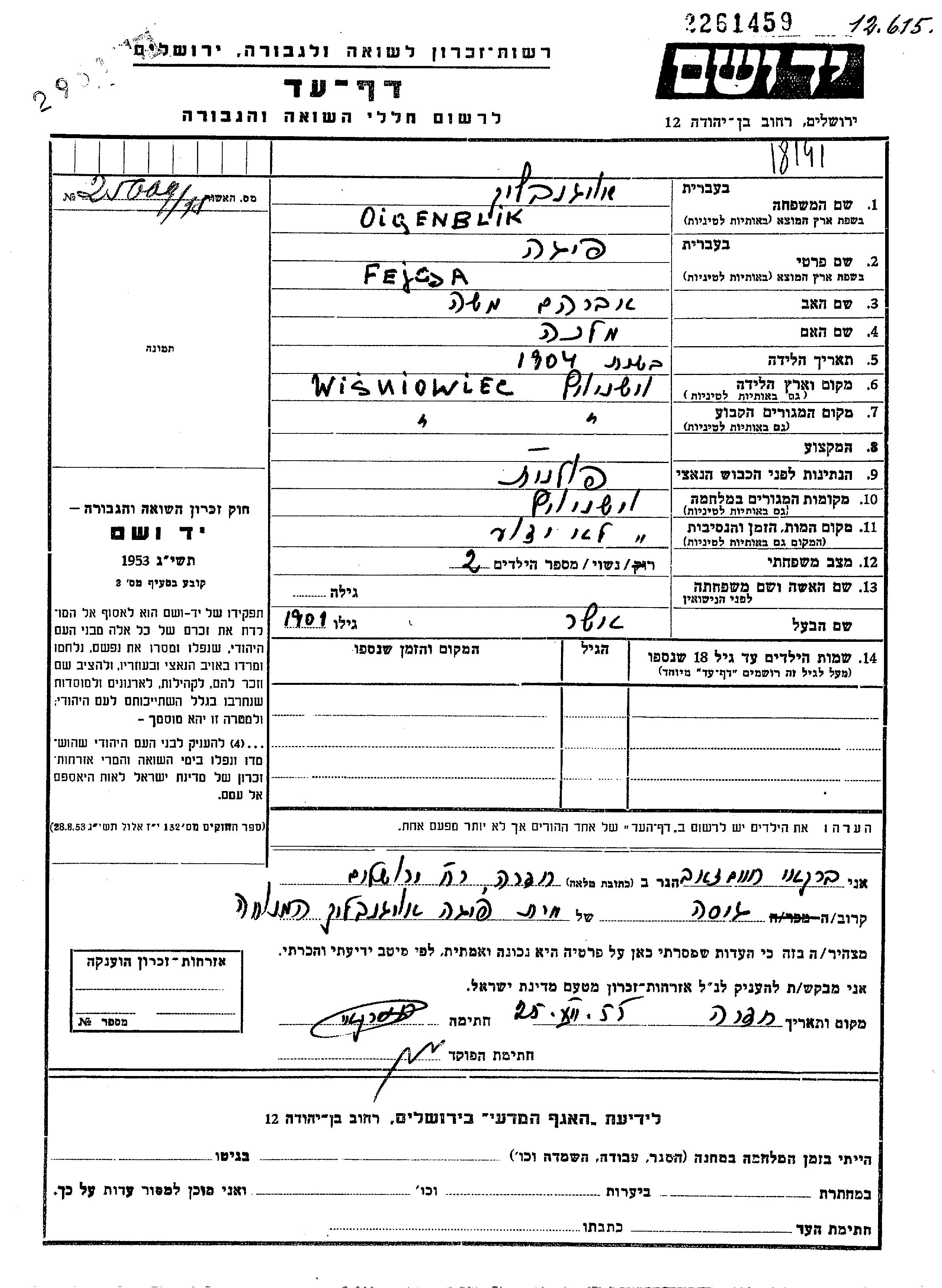 Яд Вашем - Листы свидетельских показаний Мемориального фонда