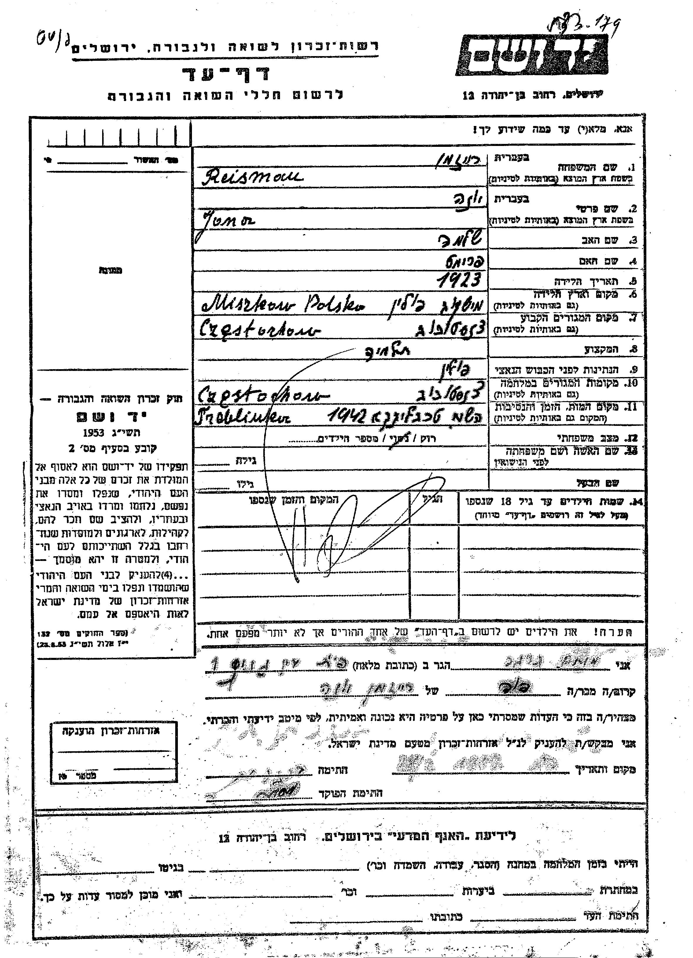 Рейсман Иона 1923 Ченстохов, Польша Лист свидетельских показаний