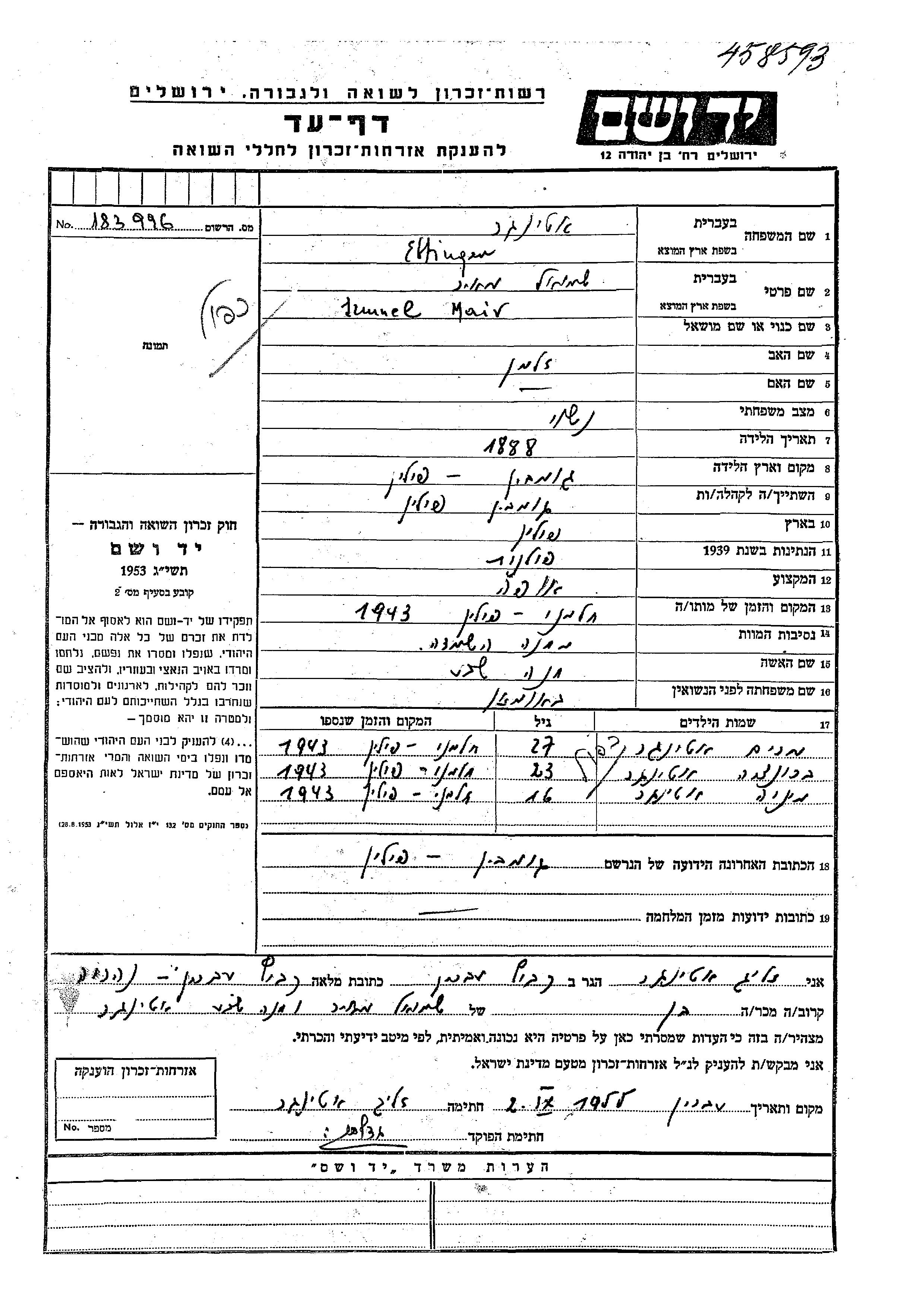 | Этингер | Мирям | 1916 | Гомбин, Польша | Лист свидетельских показаний |