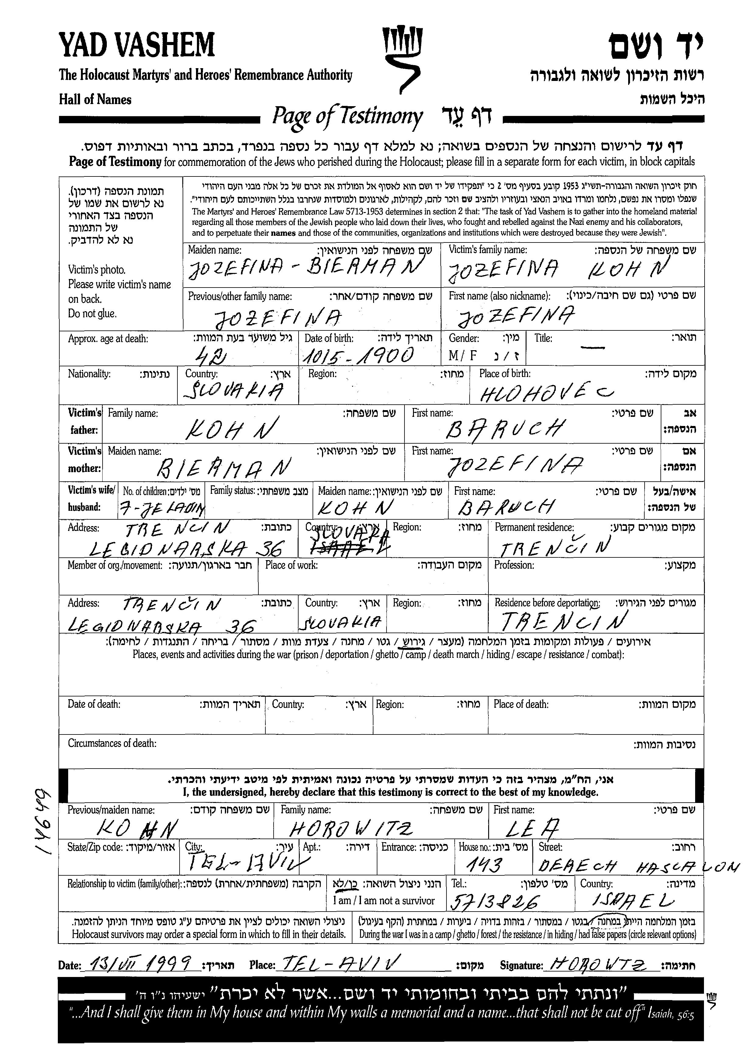 Кон | Йозефина | 1900 | Тренчин, Чехословакия | Лист свидетельских показаний |