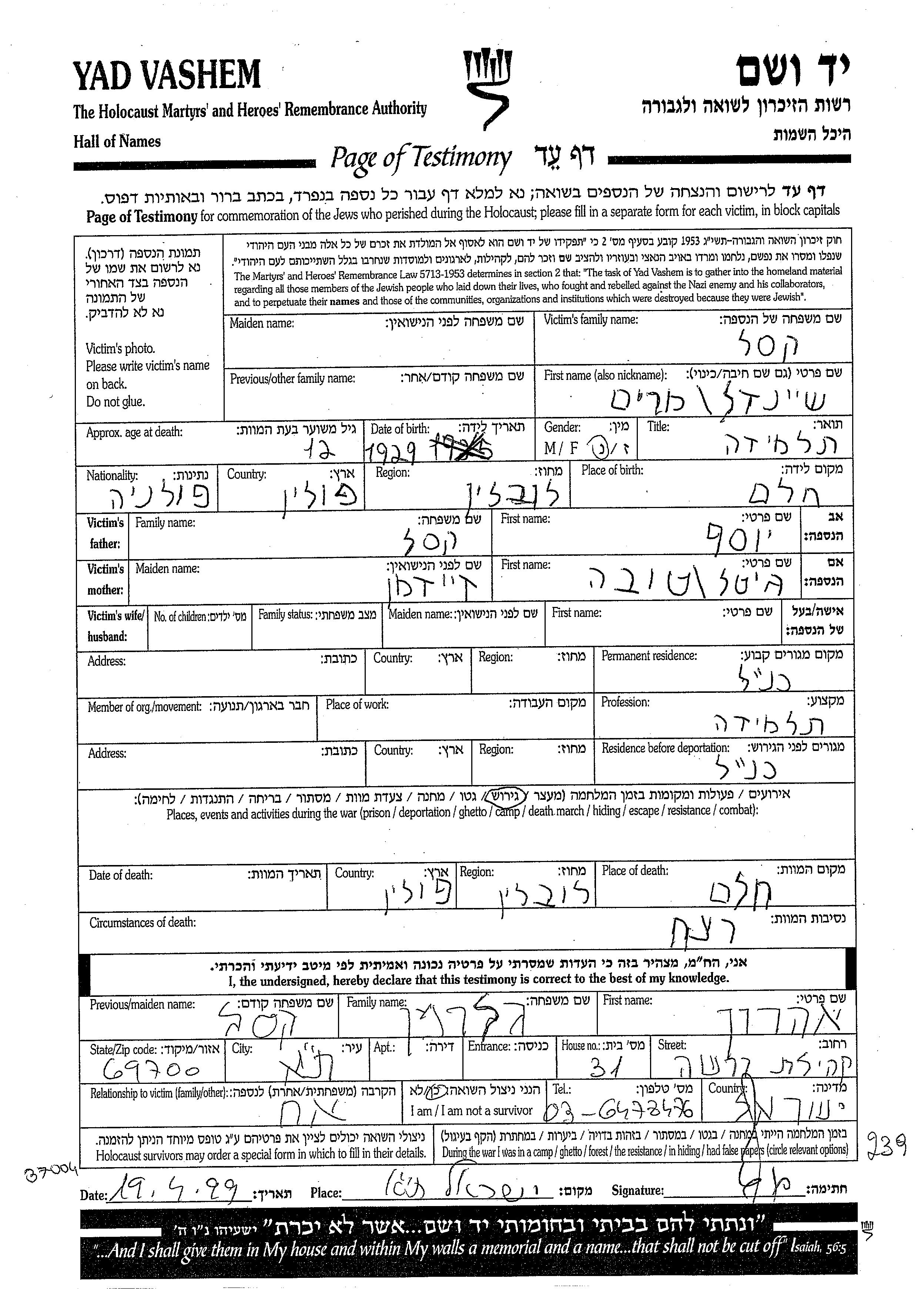 Яд Вашем - Листы свидетельских показаний Мемориального фонда