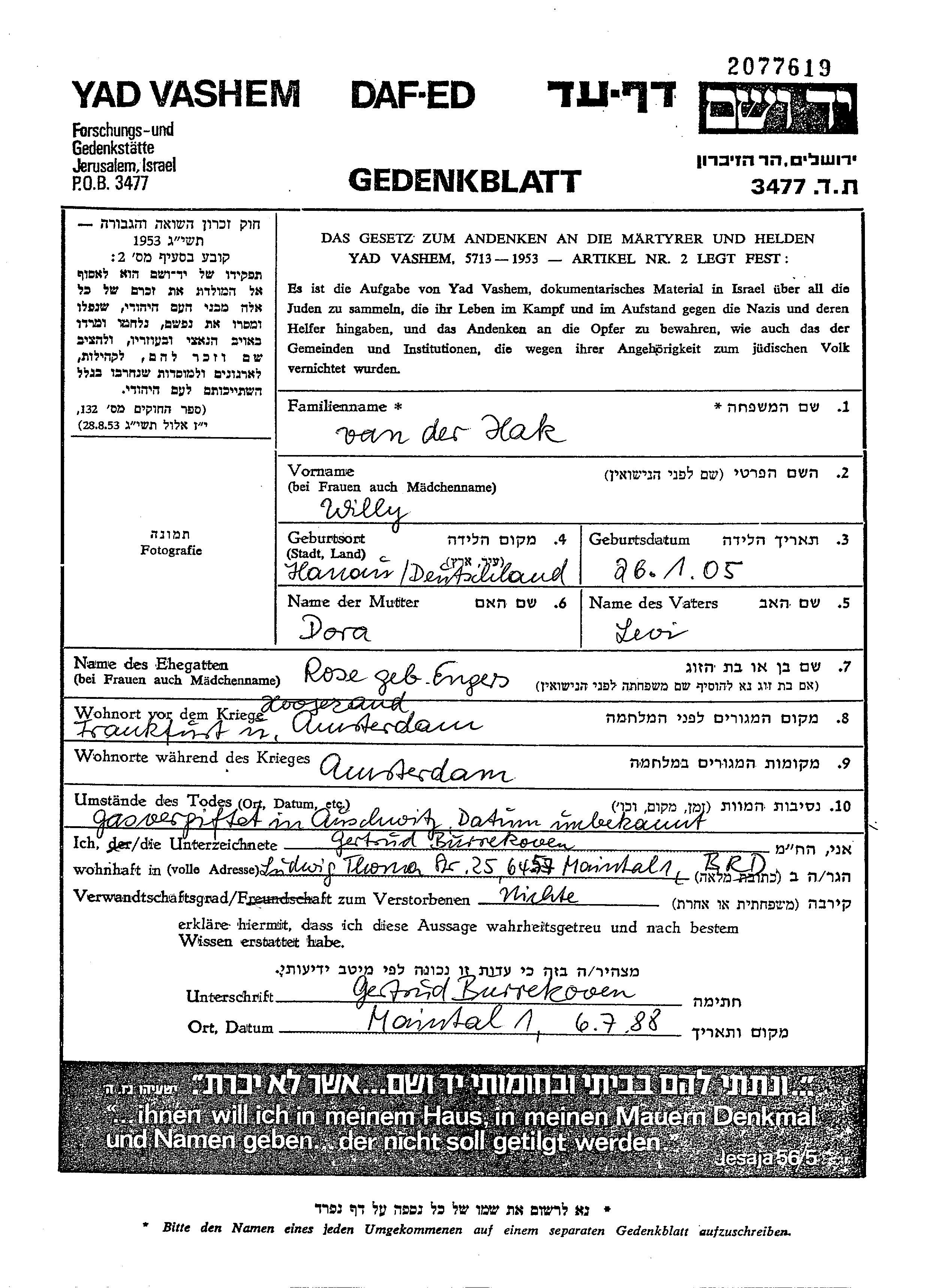 Вилли Хак ван дер, место рождения: Ханау, Германия. Место жительства до войны: Хогезанд, Нидерланды.