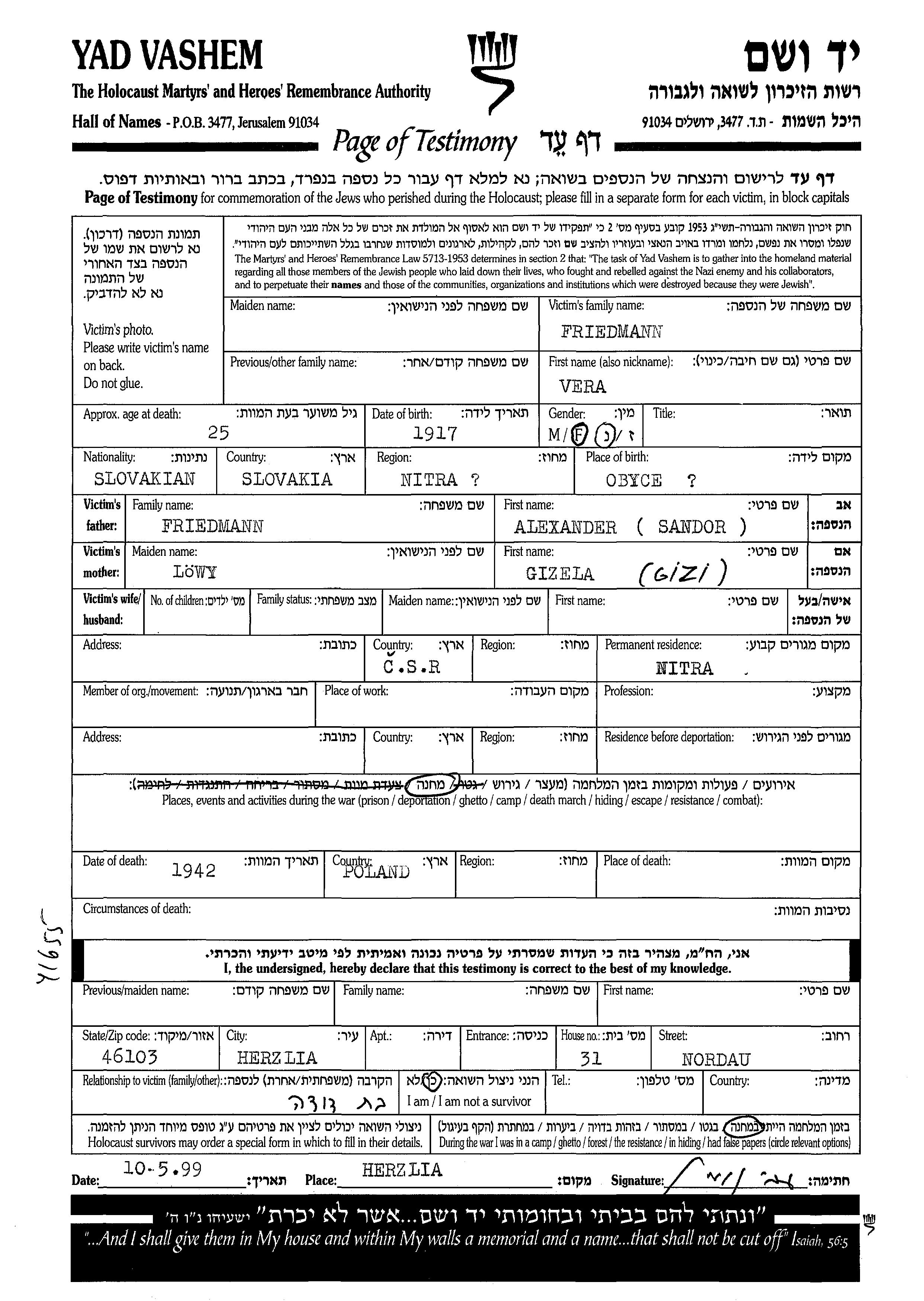 Фридманн Вера Нитра, Чехословакия Лист свидетельских показаний