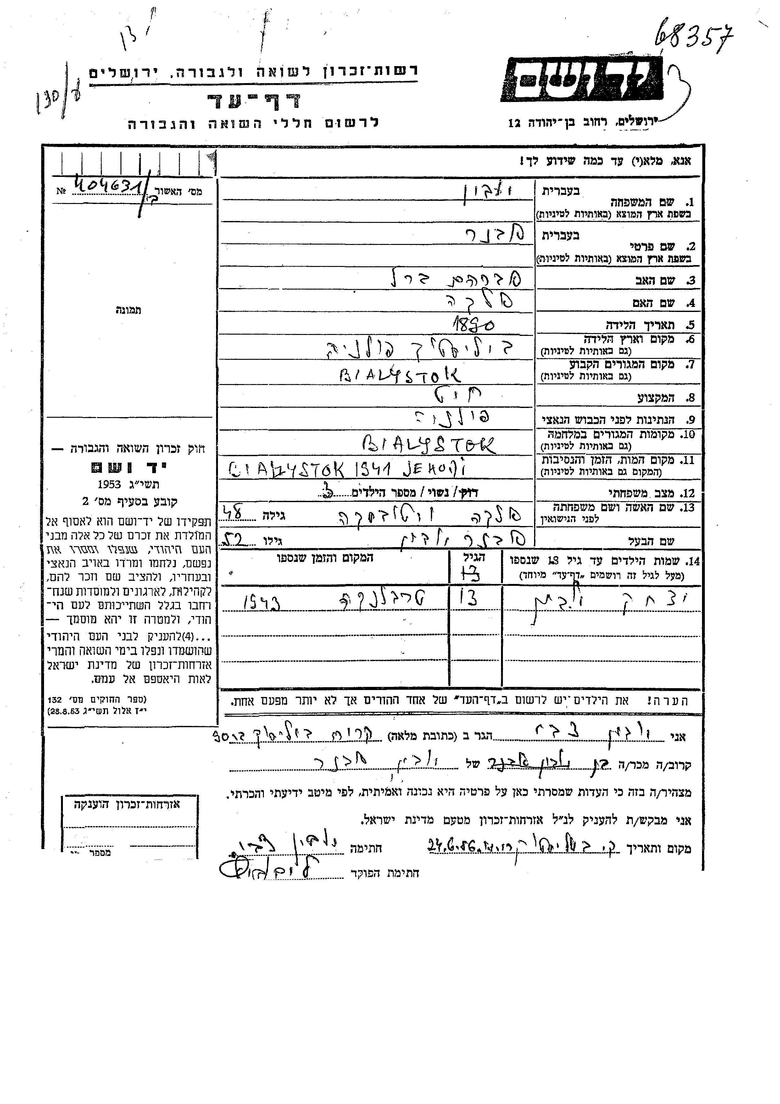 Авнер Йовин, место рождения: Белосток, Польша. Отец: Авраам Берл, mать:Слава. Портной / портниха. Женат / замужем. Место жительства до войны: Белосток, Польша. Место во время войны: Белосток, Польша.