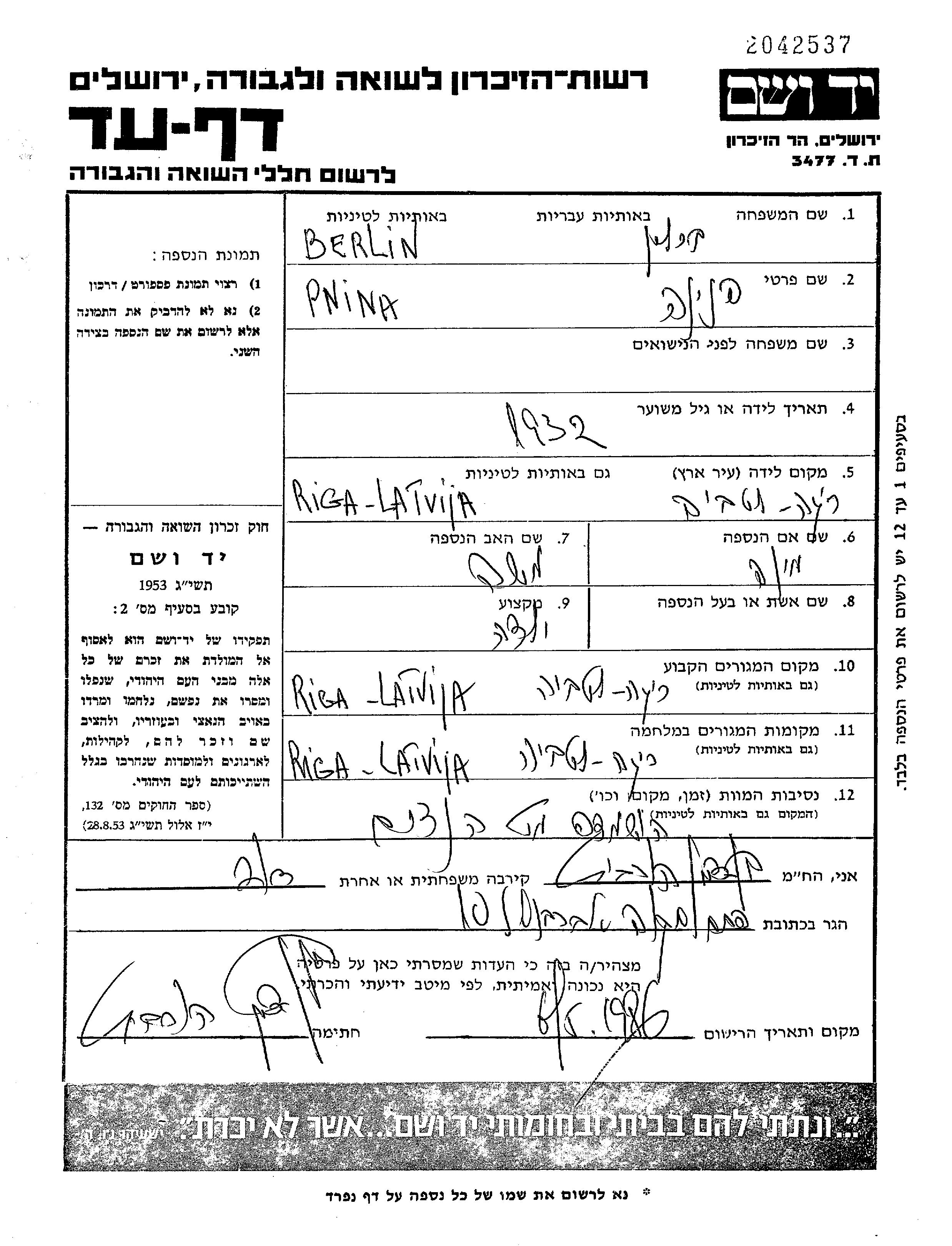 Берлин Пнина Рига, Латвия Лист свидетельских показаний