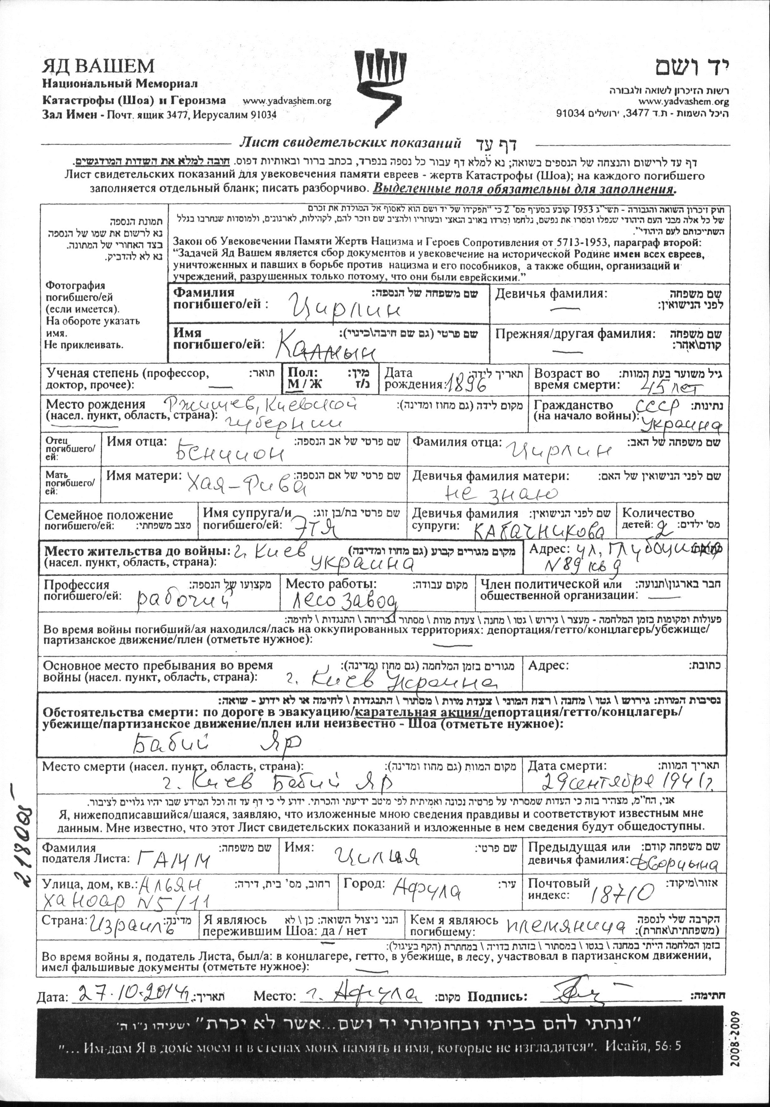 Яд Вашем - Листы свидетельских показаний Мемориального фонда