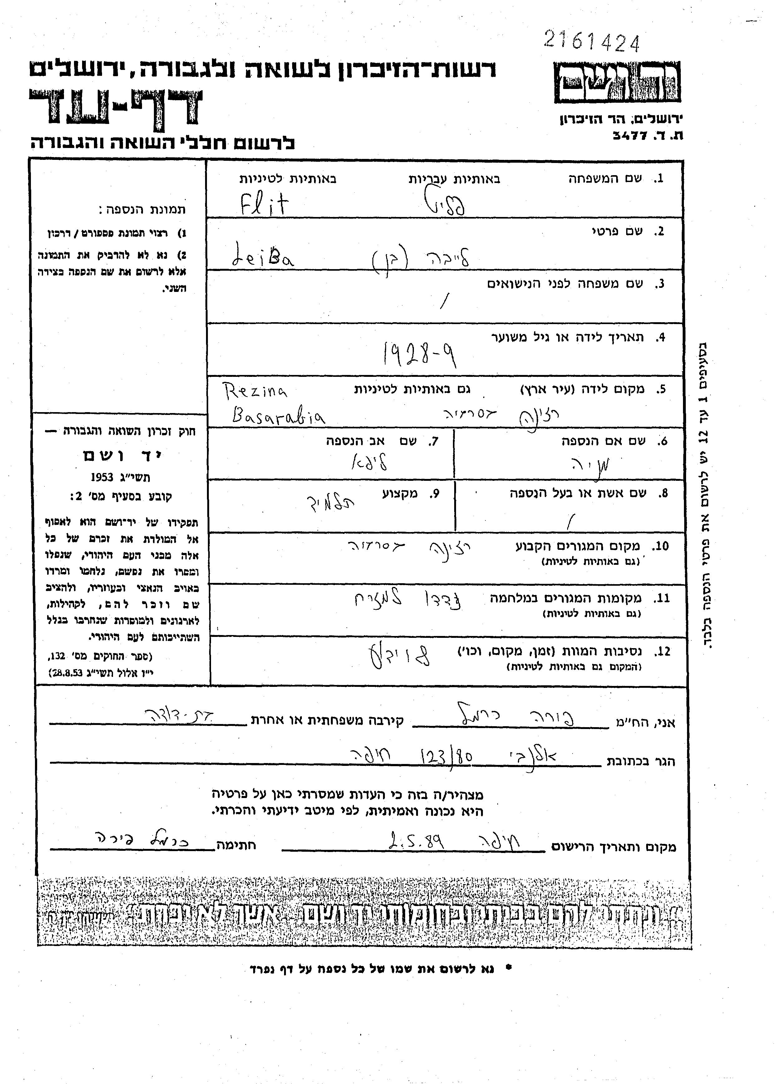 Флит | Лейба | 1928 | Резина, Румыния | Лист свидетельских показаний |