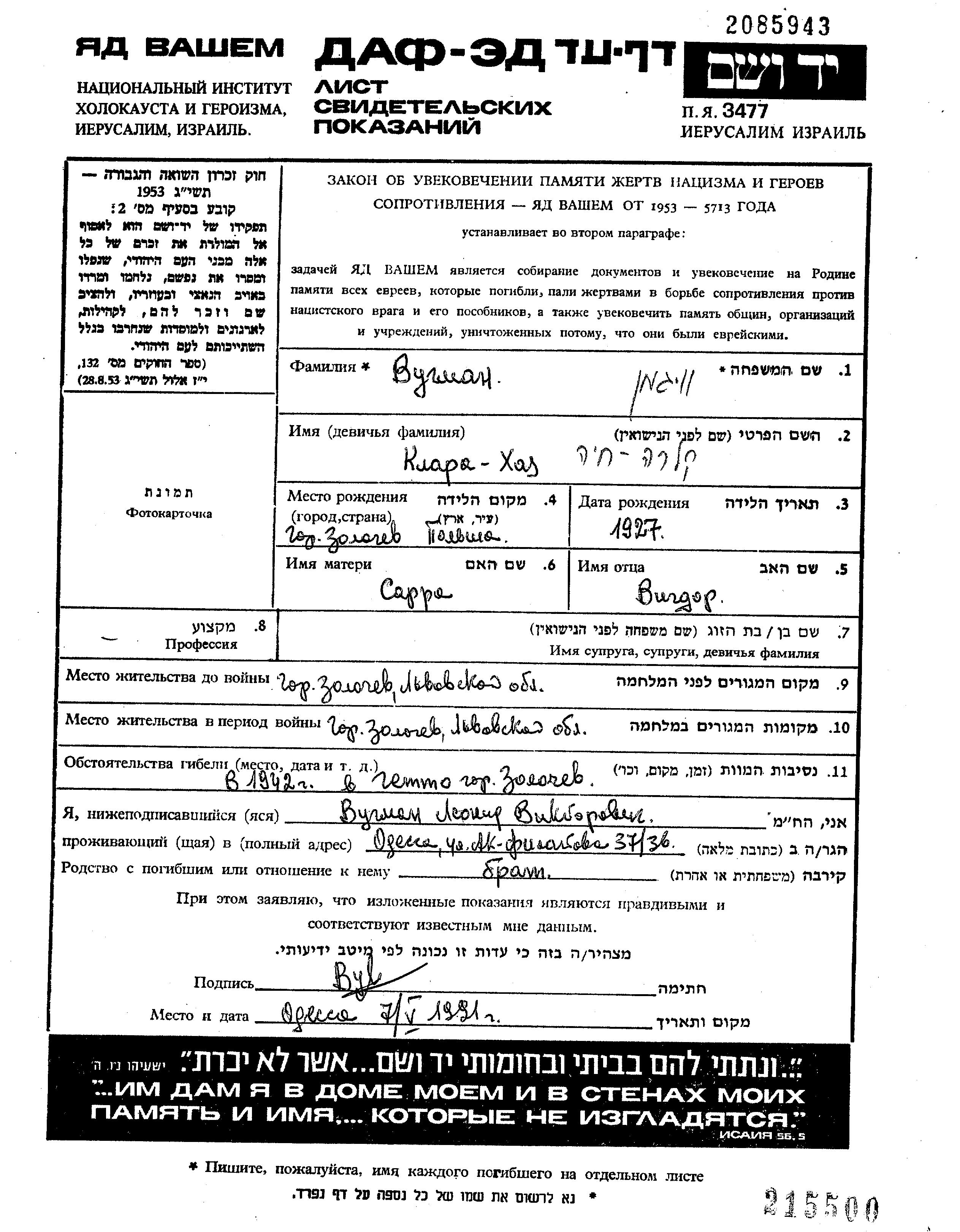 Вугман Хая Клара 1927 Злочов, Польша Лист свидетельских показаний