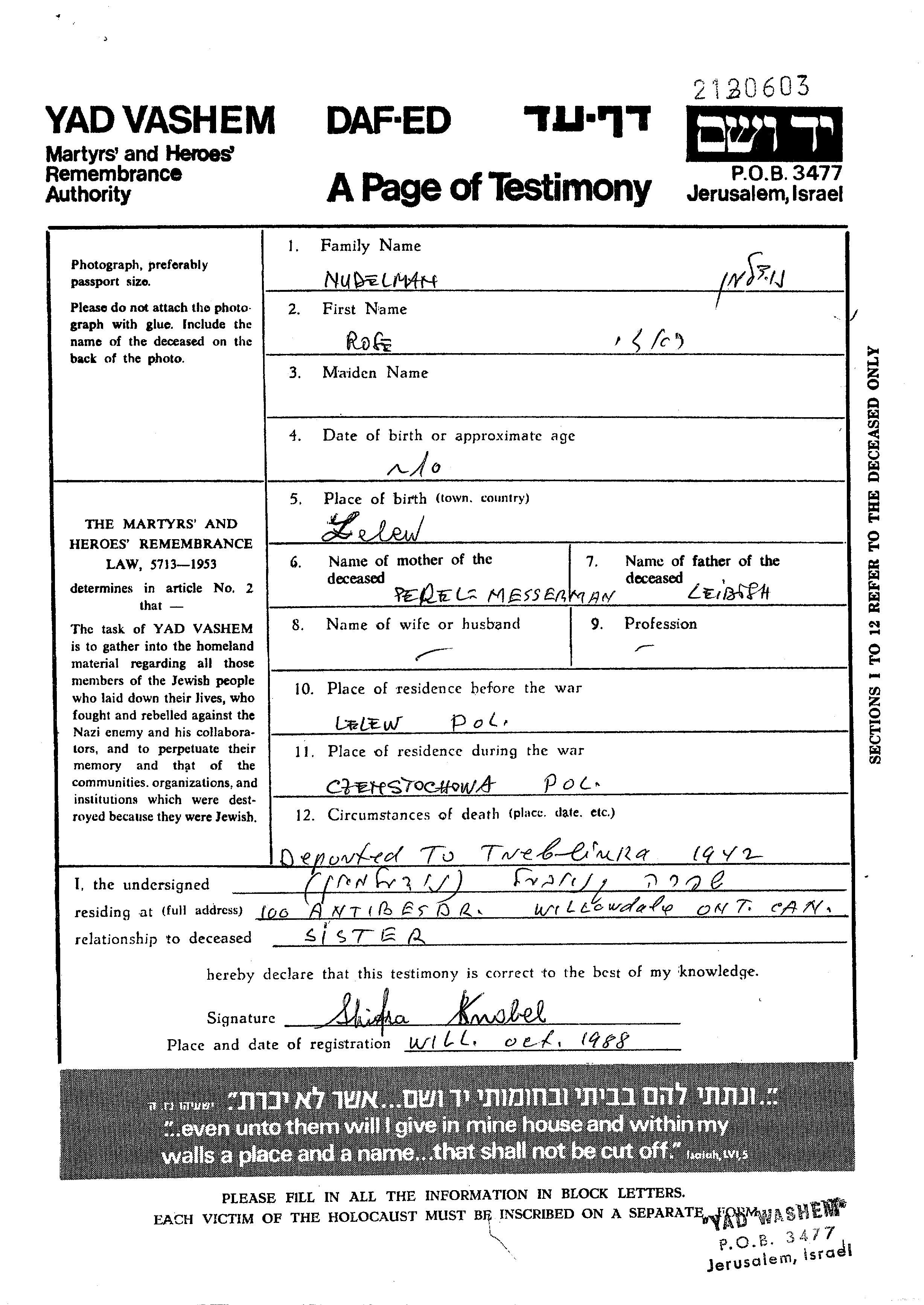 Нудельман Роза 1932 Лелув, Польша Лист свидетельских показаний