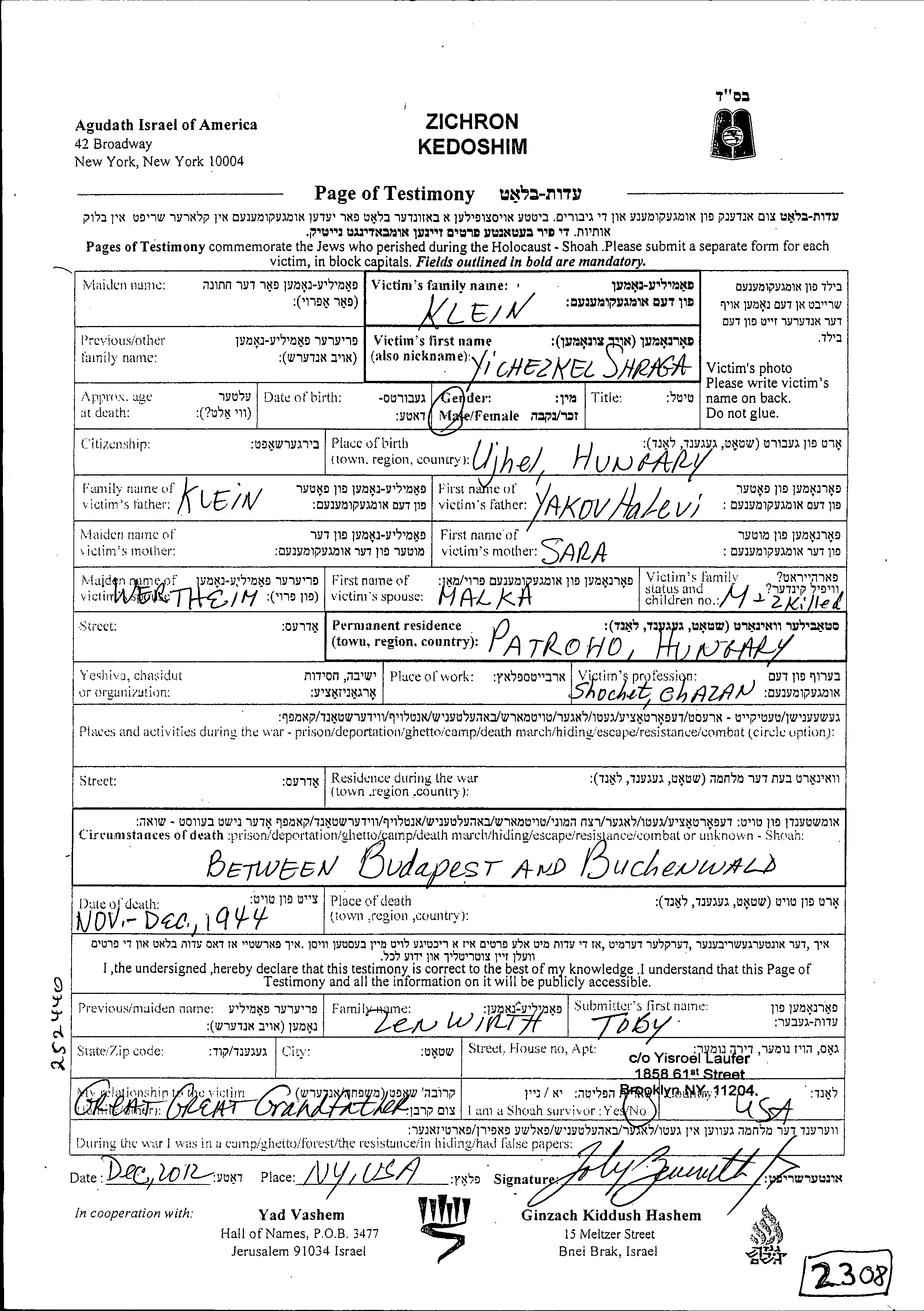 Клейн Иехезкель Патроха, Венгрия Лист свидетельских показаний