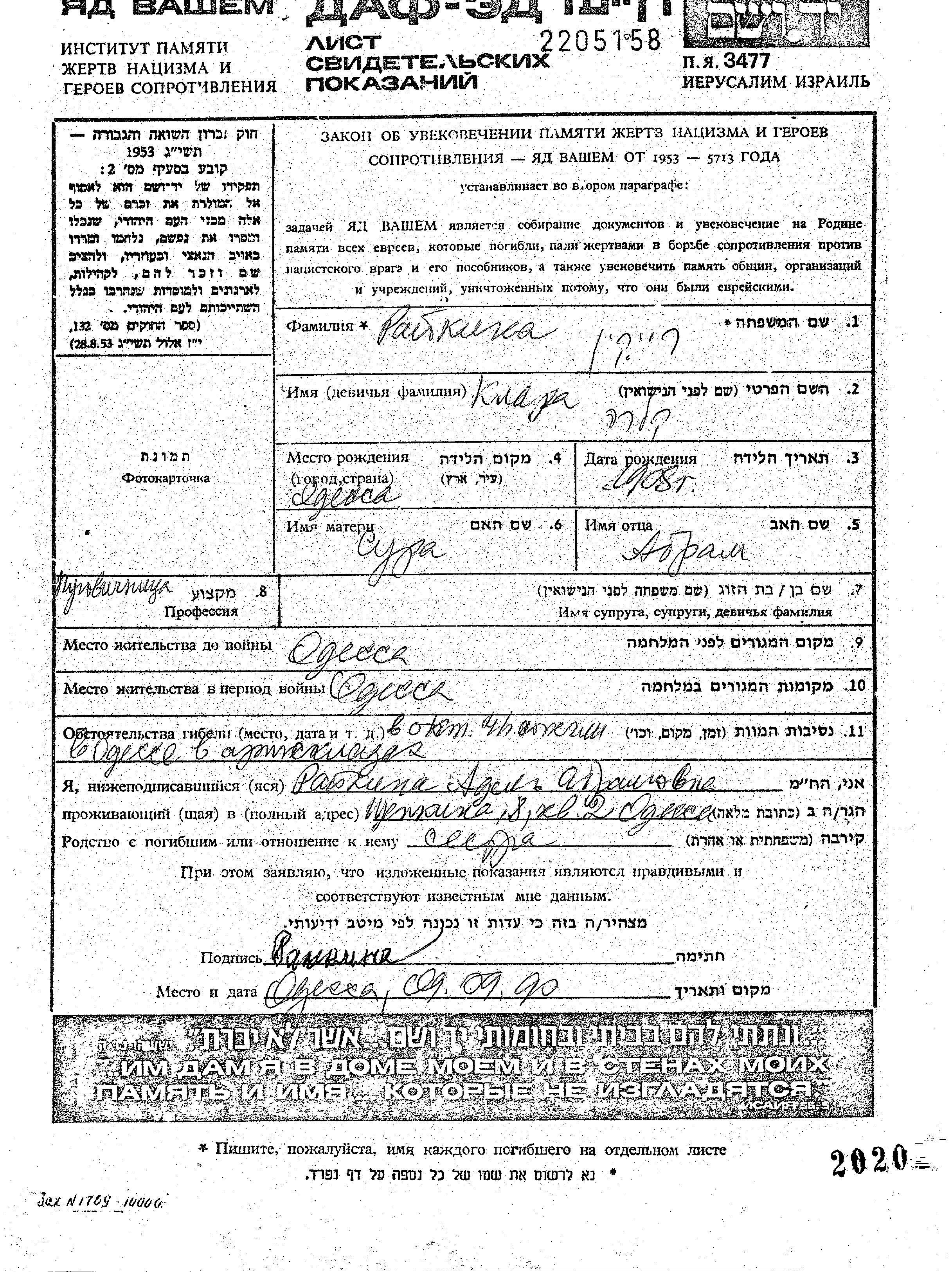 | Райкин | Клара | 1908 | Одесса, Украина (СССР) | Лист свидетельских показаний |