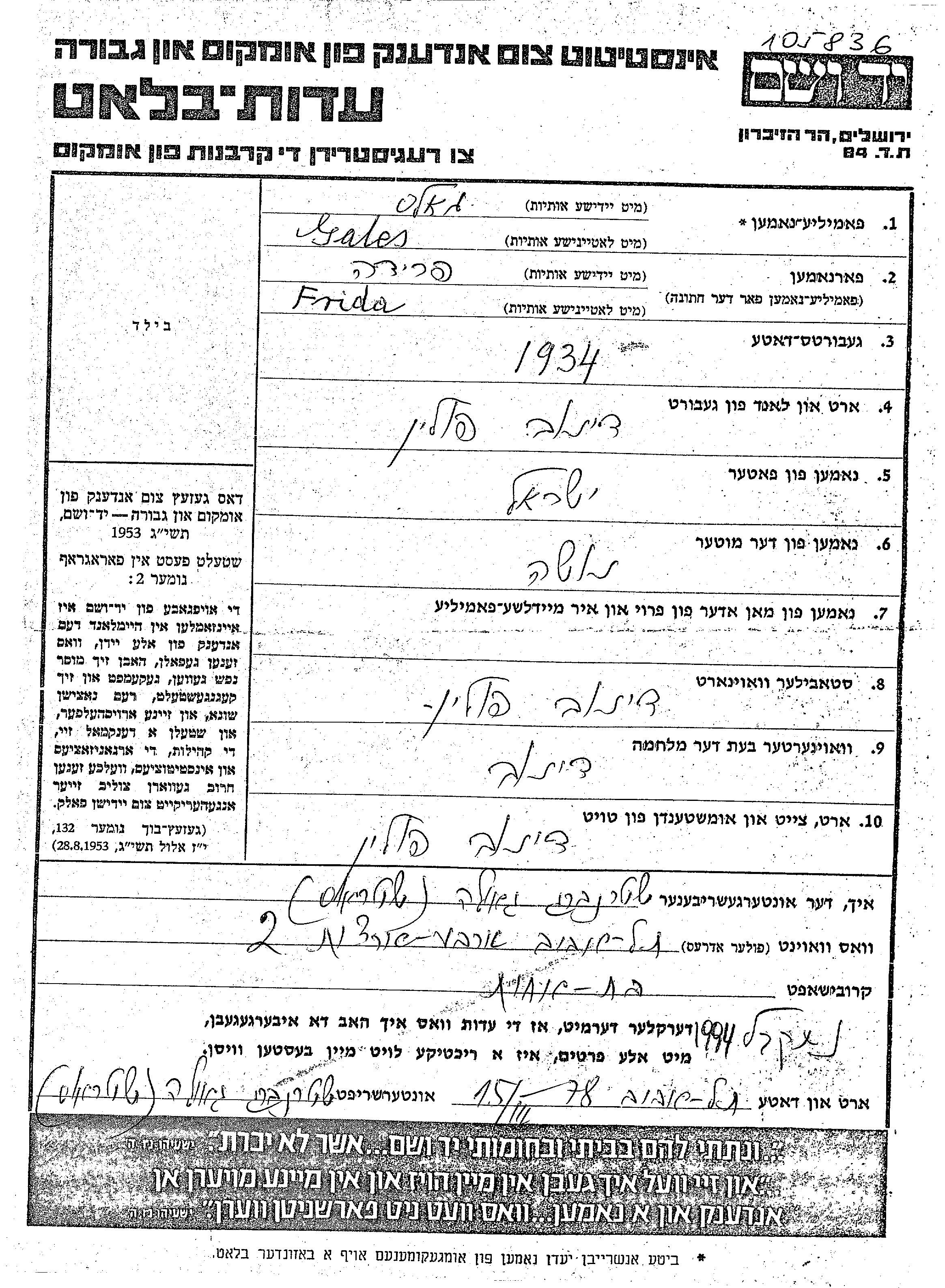 Яд Вашем - Листы свидетельских показаний Мемориального фонда