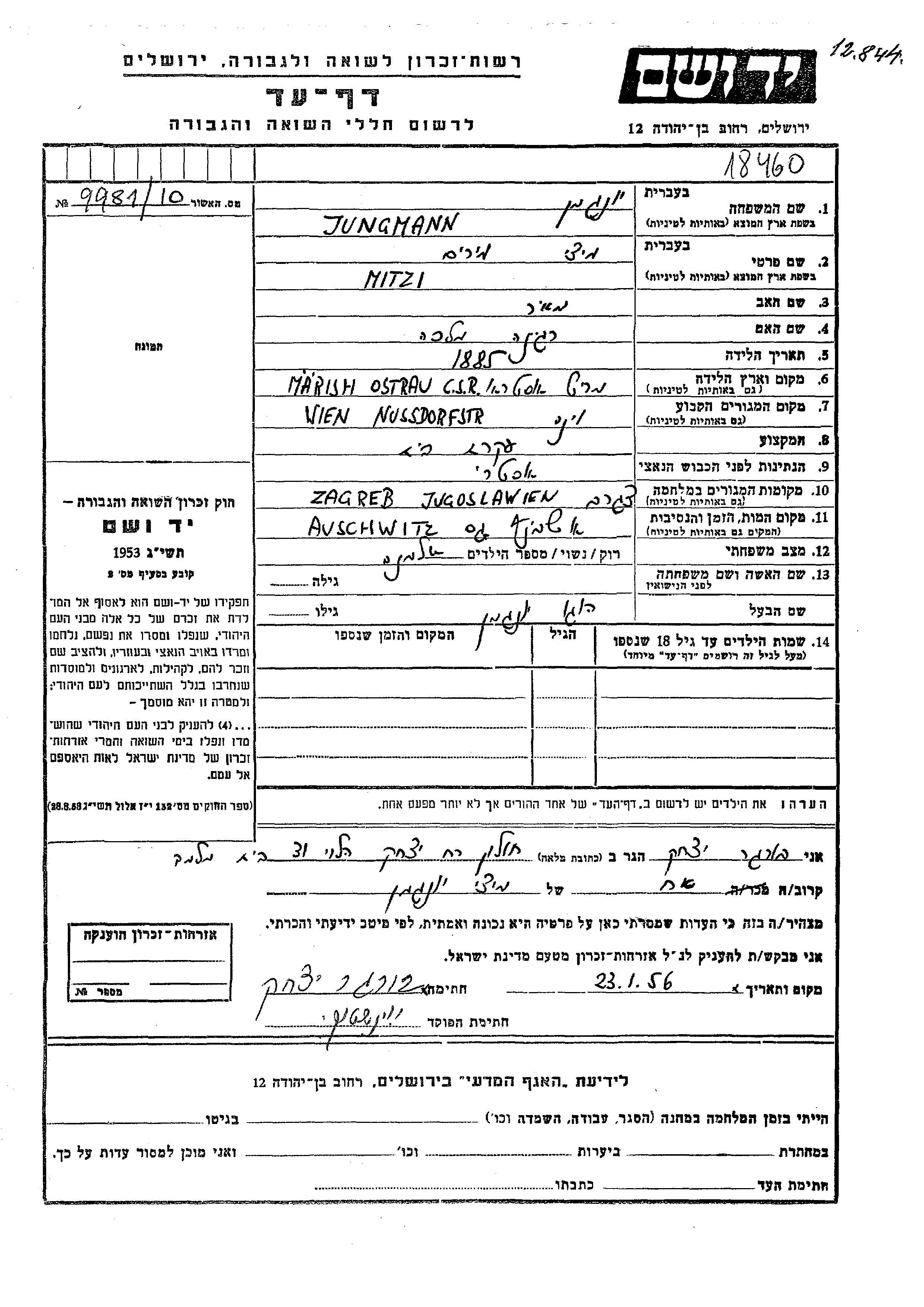 Мици Юнгманн, место рождения: Моравска Острава, Чехословакия. Отец: Меир, mать:Регина Малка. Домохозяйка. Вдова. Место жительства до войны: Вена, Австрия. Место во время войны: Загреб, Югославия.