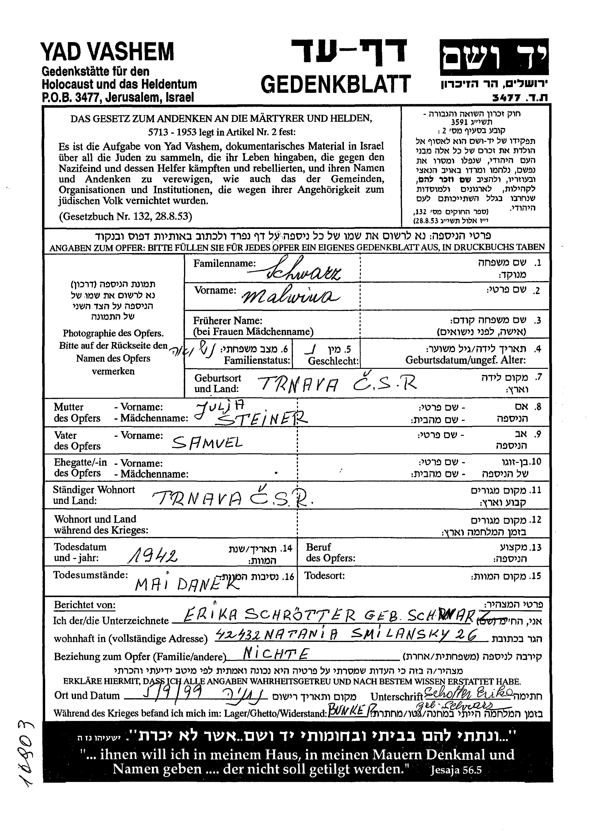 Мальвина Малька Шварц, место рождения: Трнава, Чехословакия. Домохозяйка. Место жительства до войны: Трнава, Чехословакия.