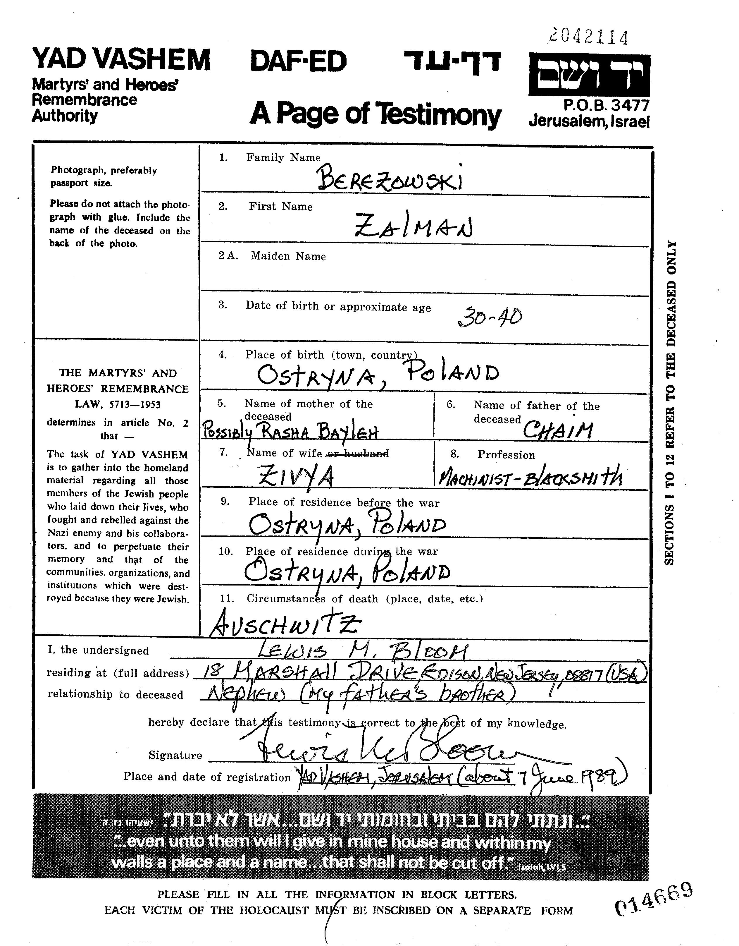 Березовски Залман Ostryna, Польша Лист свидетельских показаний
