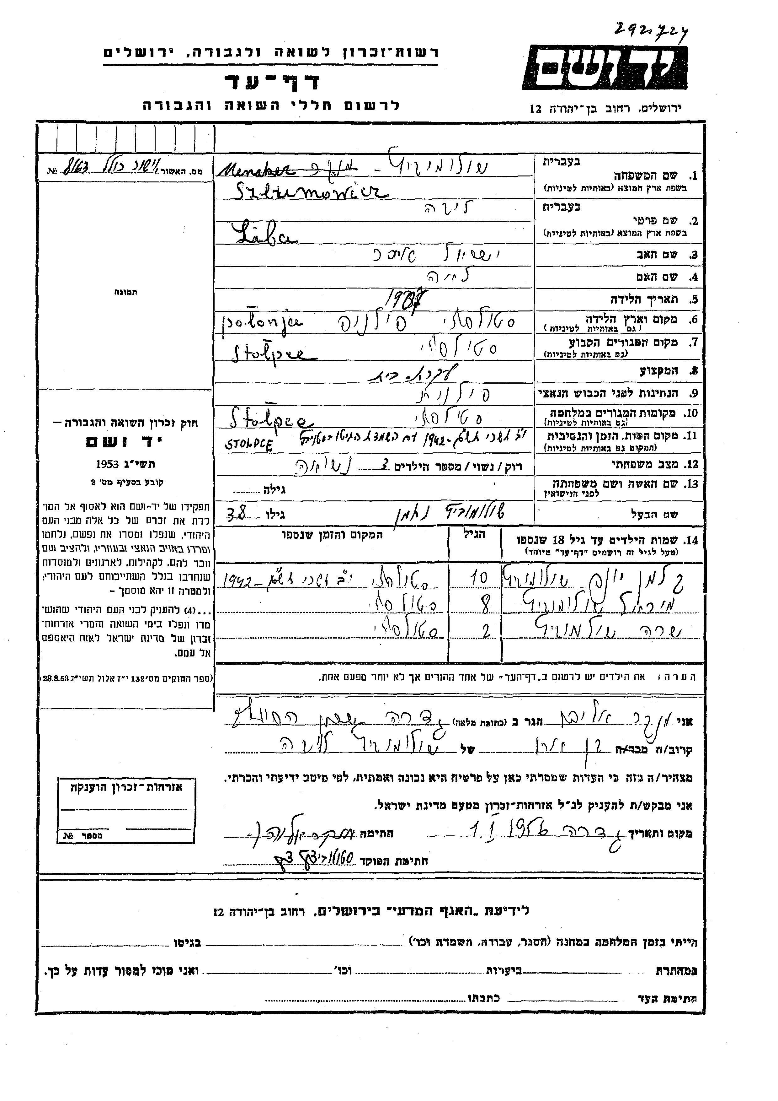 Шлумович Шоломовиц Михаэль Столбцы, Польша Лист свидетельских показаний