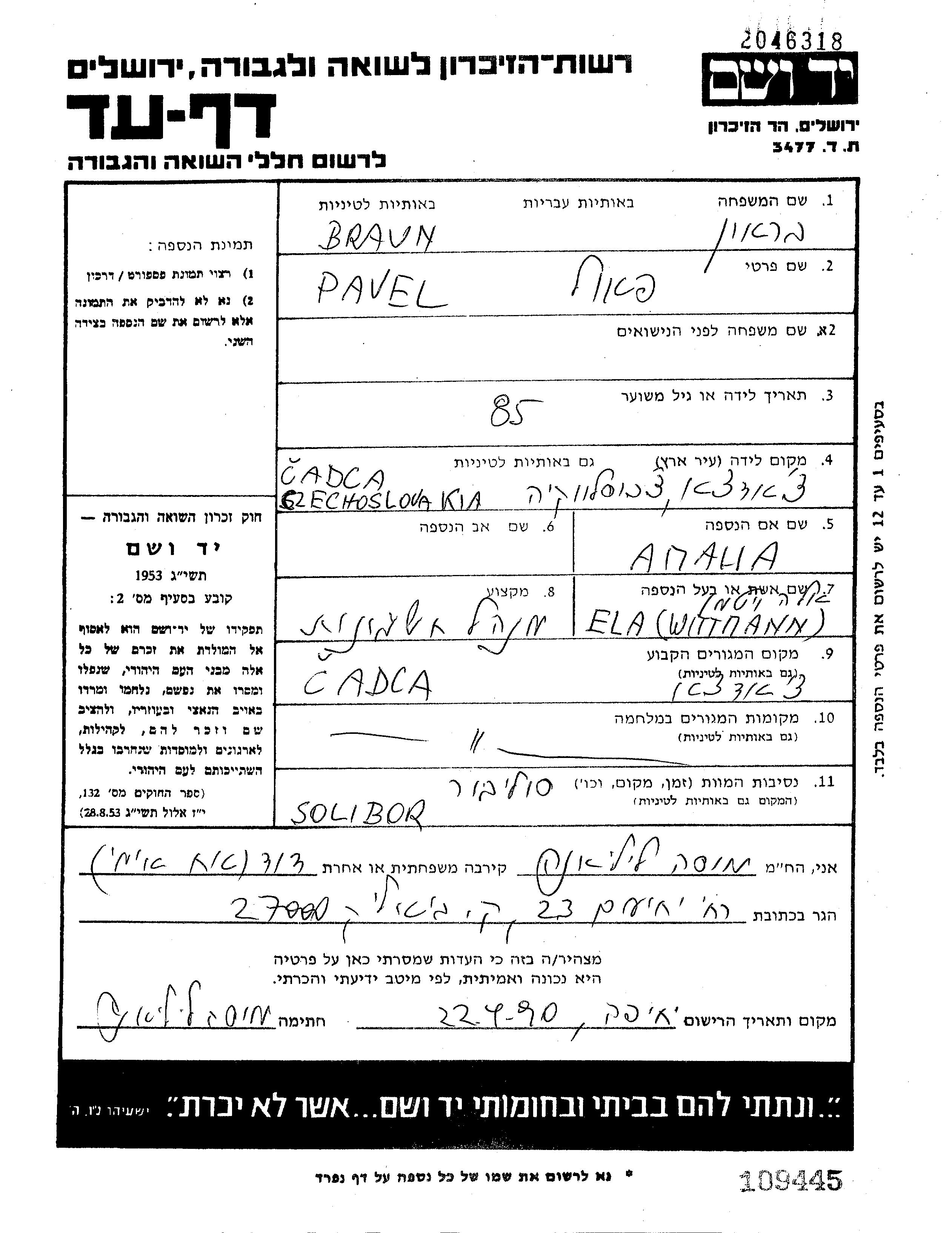 Браун Павел Пауль Чадца, Чехословакия Лист свидетельских показаний