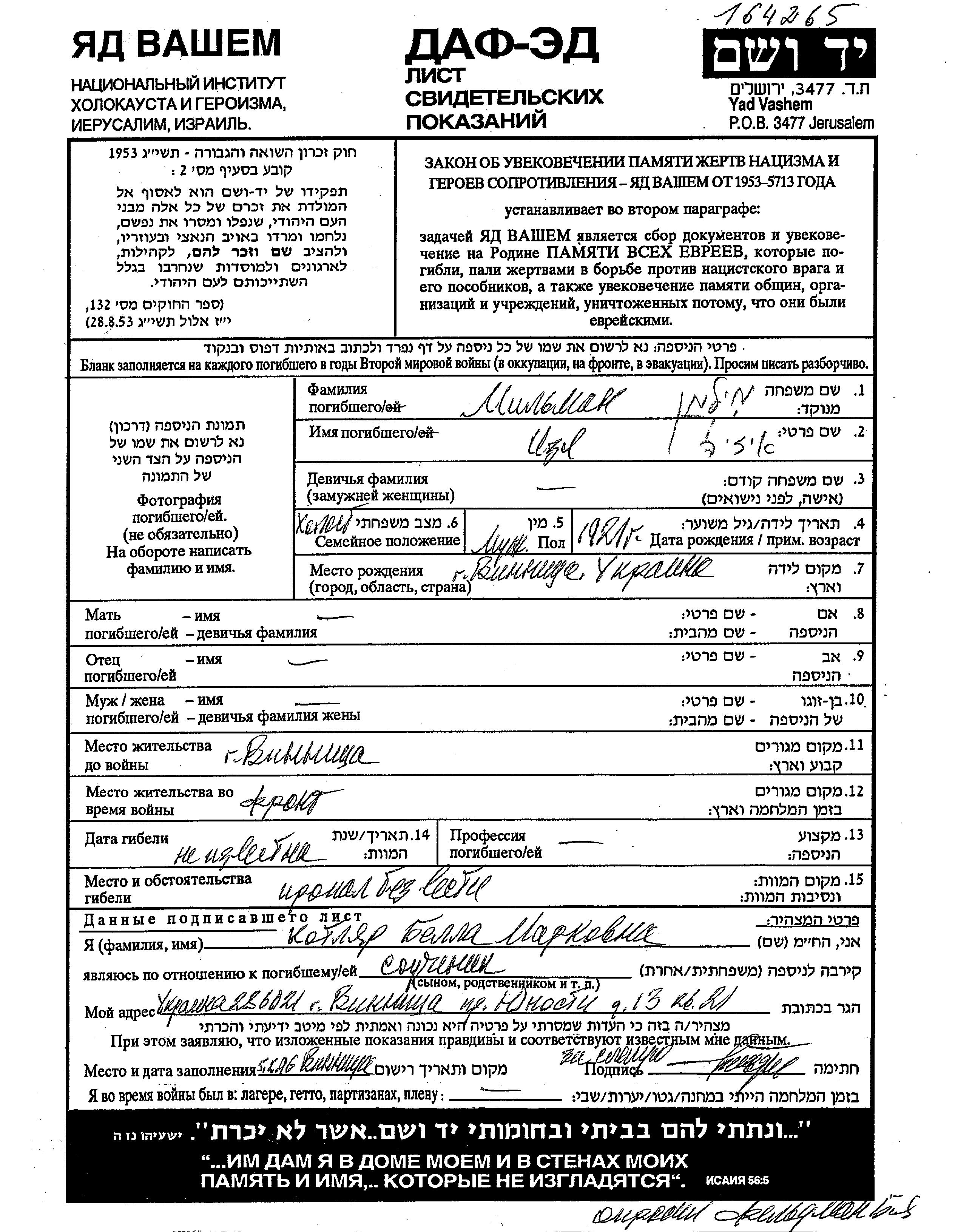 Мильман Изя 1921 Винница, Украина (СССР) Лист свидетельских показаний