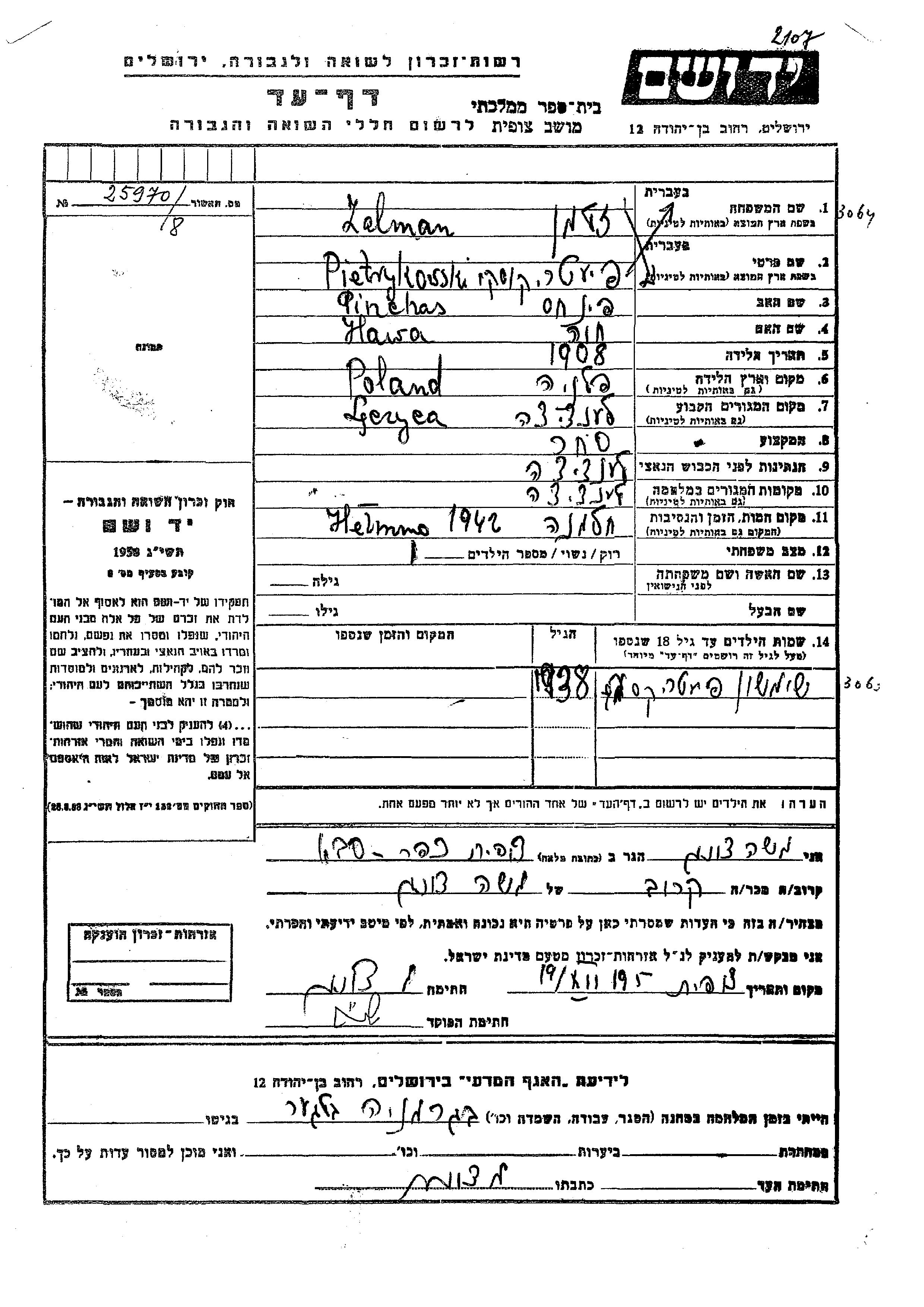 Залман Петриковски, место рождения: Польша. Отец: Пинхас, mать:Хава. Торговец / торговка. Женат / замужем. Место жительства до войны: Ленчица, Польша. Место во время войны: Ленчица, Польша.