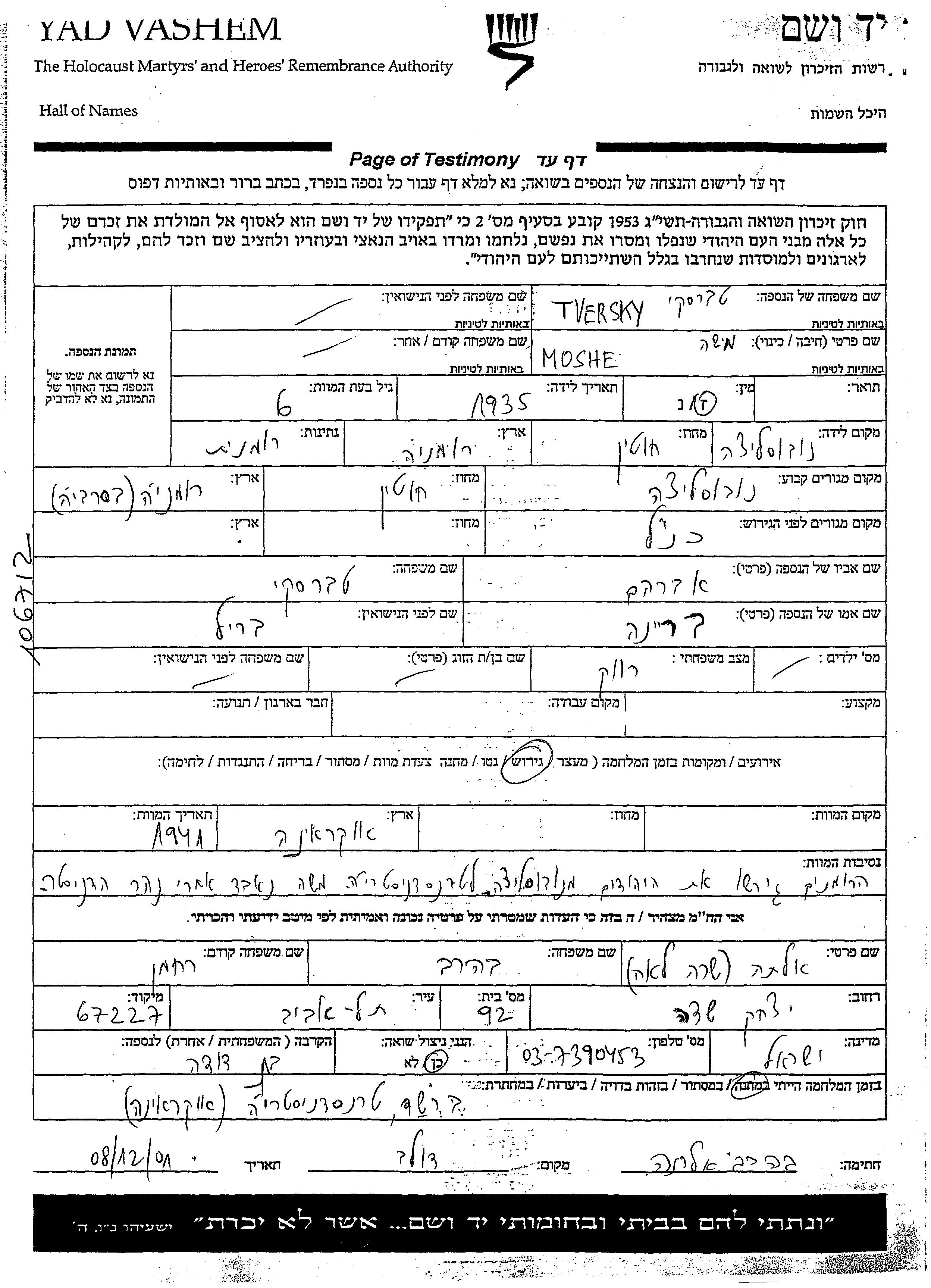 Тверский Моше 1935 Ноуэ Сулица, Румыния Лист свидетельских показаний