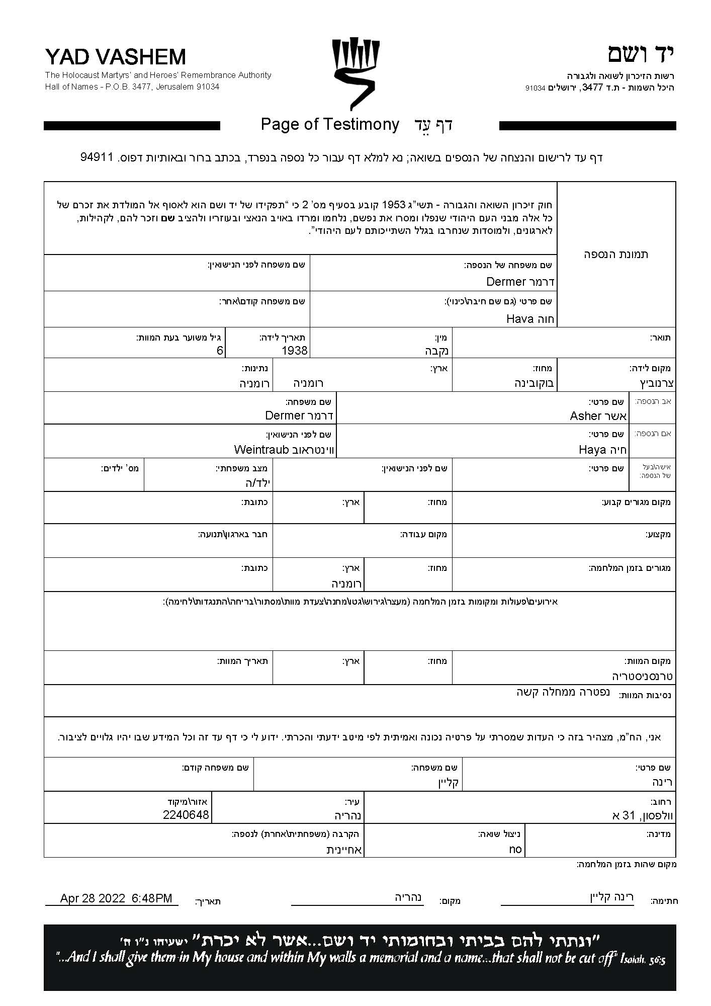 Хава Дермер, место рождения: Черновице Буковина, Румыния. Отец: Ашер, mать:Хая, девичья фамилия Вейнтрауб. Ребенок. Место во время войны: Румыния.