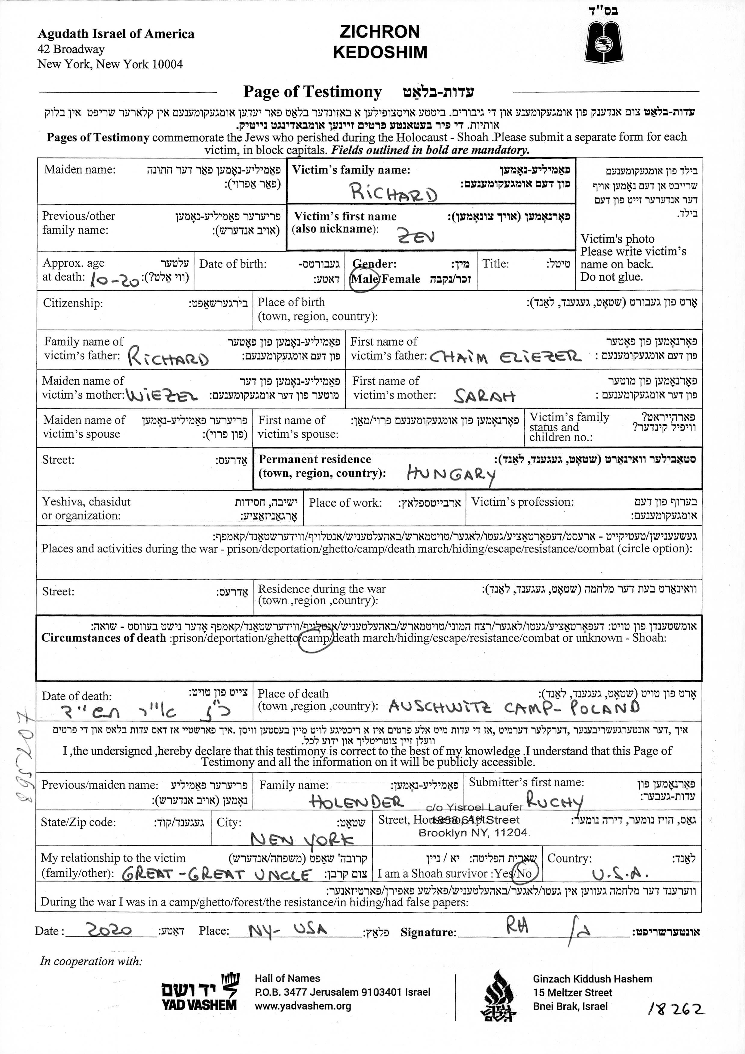 Зев Рихард Хаим Элиэзер Сара девичья фамилия Визель. Подросток. Место жительства до войны: Венгрия. Место во время войны: Аушвиц, Польша.