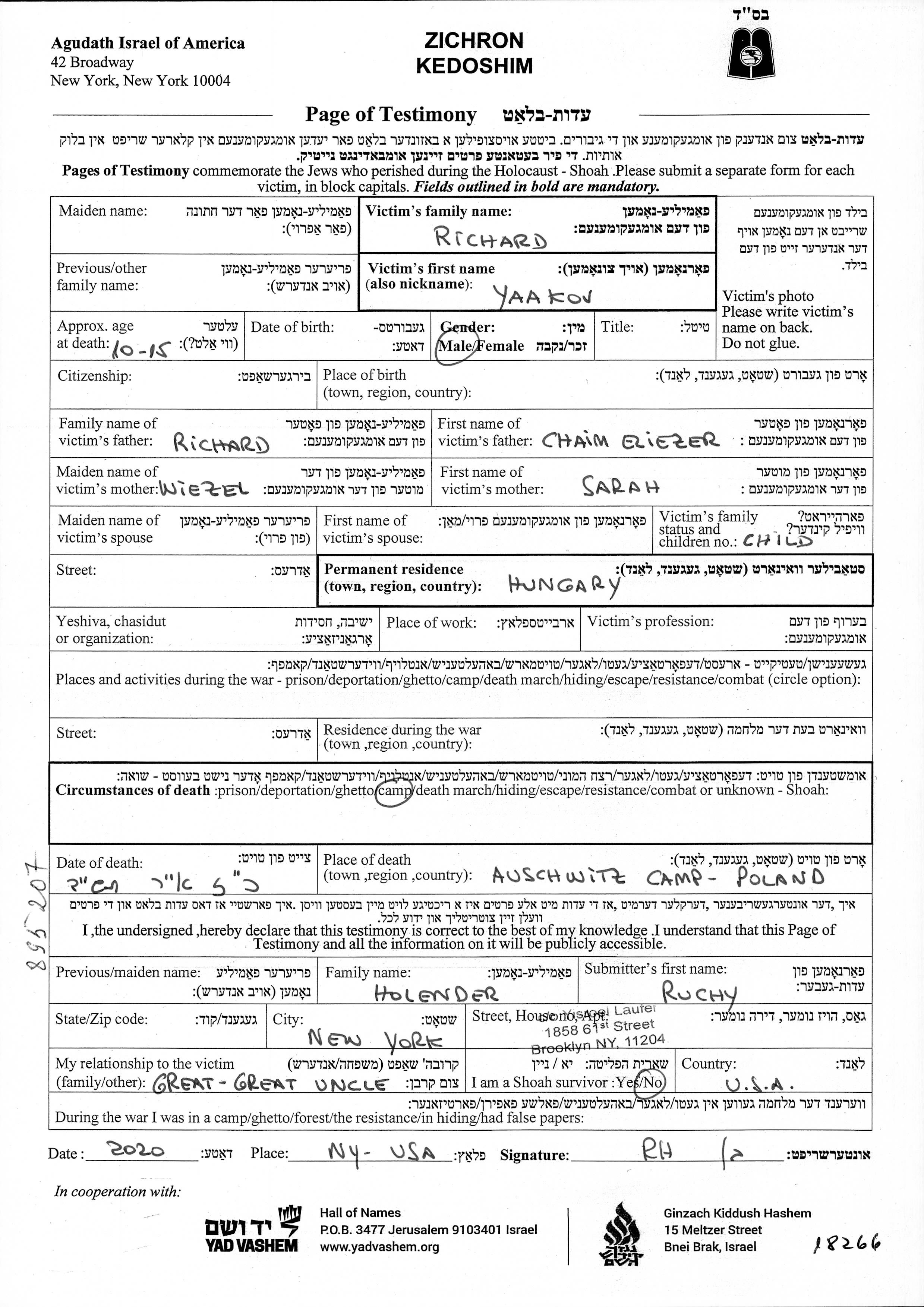 Яаков Рихард Хаим Элиэзер Сара девичья фамилия Визель. Ребенок. Место жительства до войны: Венгрия. Место во время войны: Аушвиц, Польша.