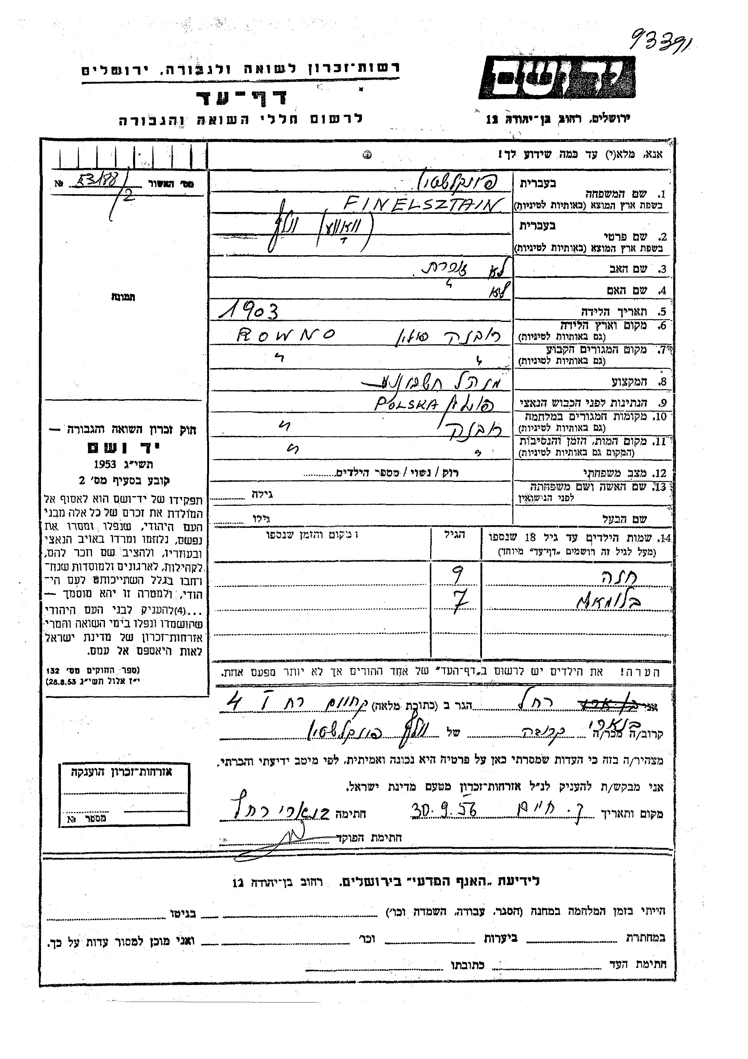 Вольф Вовэ Финельштайн Финкельштейн, место рождения: Ровно, Польша. Бухгалтер / счетовод. Место жительства до войны: Ровно, Польша. Место во время войны: Ровно, Польша.