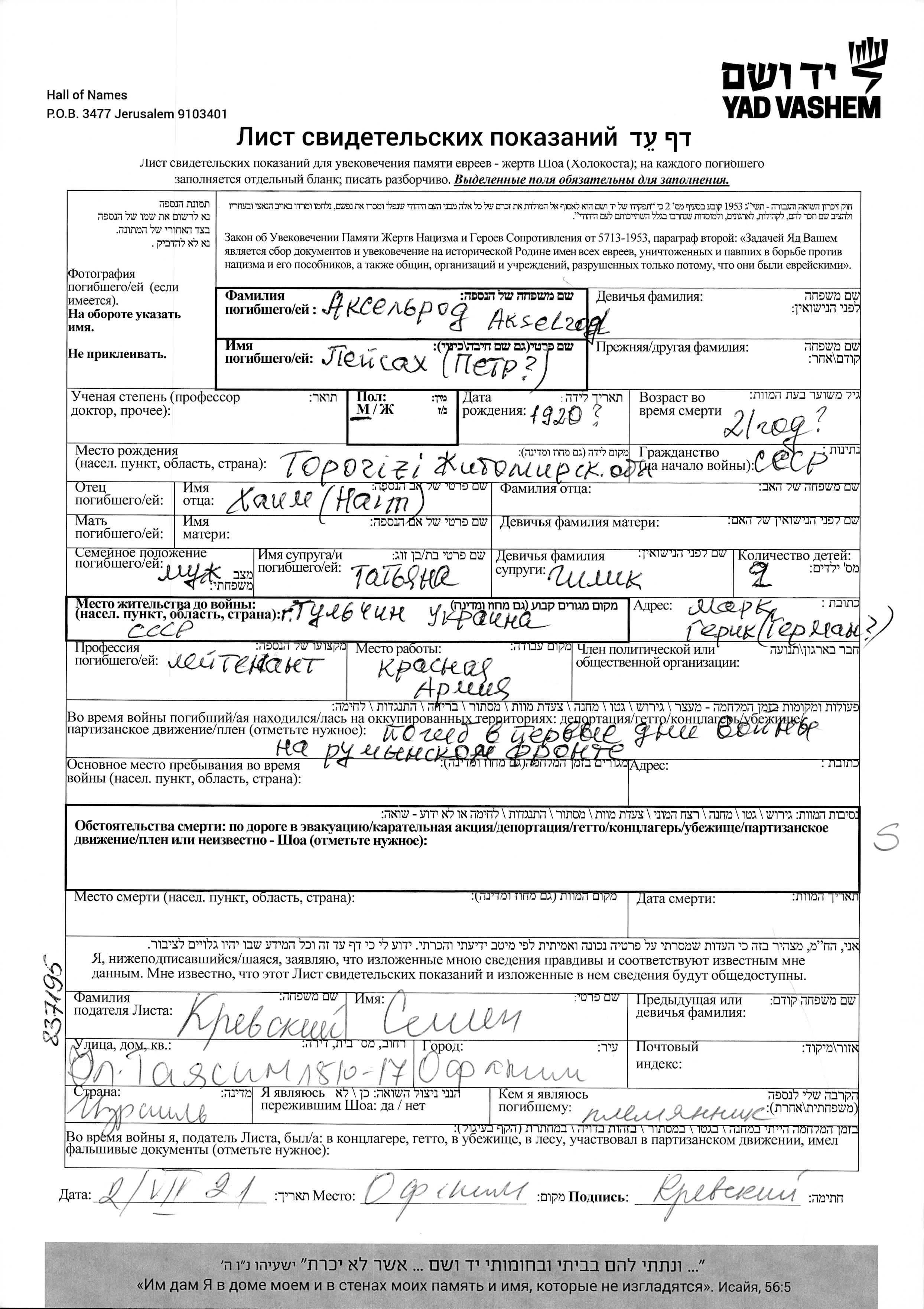 Пейсах Пётр Аксельрод, место рождения: Житомирская Обл., Украина (СССР). Отец: Хаим. Лейтенант. Женат / замужем. Место жительства до войны: Тульчин, Украина (СССР). Место во время войны: Вооруженные силы Советского Союза. Пейсах Пётр погиб на военной службе. место смерти: СССР в 1941.