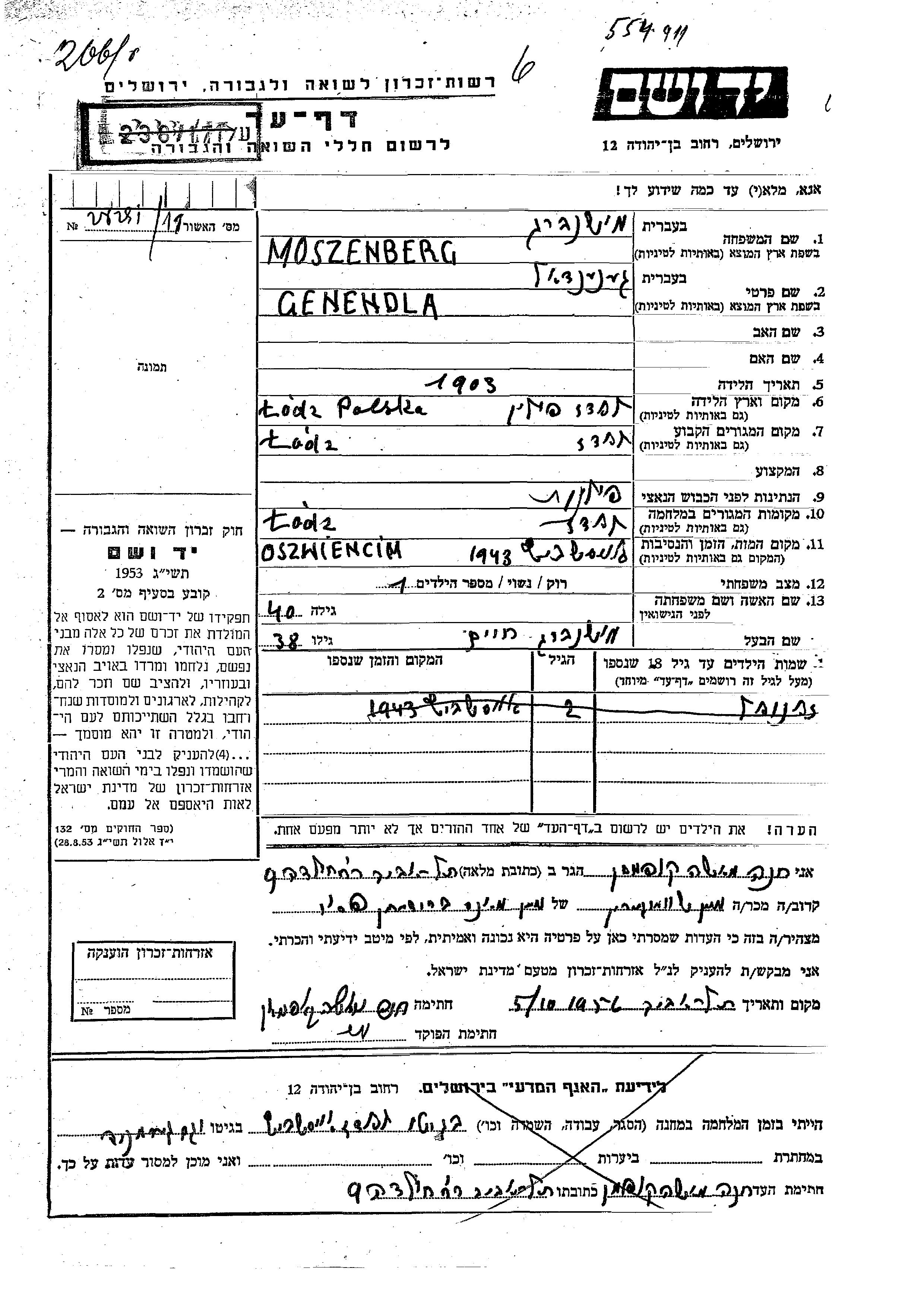 Мошенберг Генендла 1903 Лодзь, Польша Лист свидетельских показаний