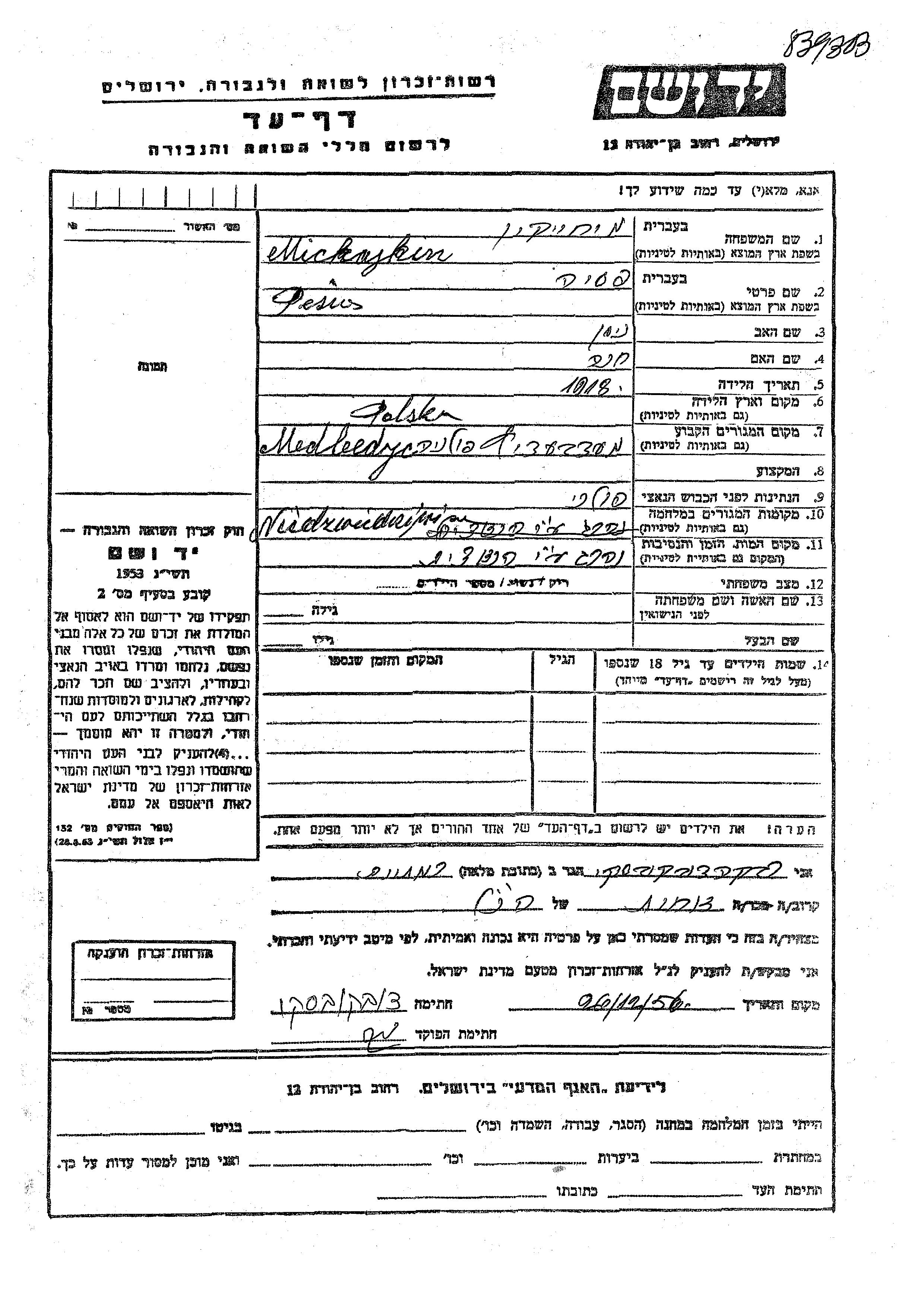 Песя Михайкин, место рождения: Польша. Отец: Нисан, mать:Хана. Холост / не замужем. Место жительства до войны: Медведичи, Польша. Место во время войны: Медведичи, Польша.