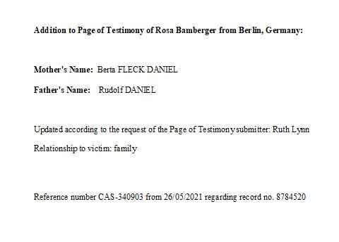 Роза Бамбергер, девичья фамилия Даниэль, место рождения: Netztal, Польша. Место жительства до войны: Берлин, Германия. Роза уничтоженa в период Шоа. место смерти: Берлин, Германия в 07/01/1940.