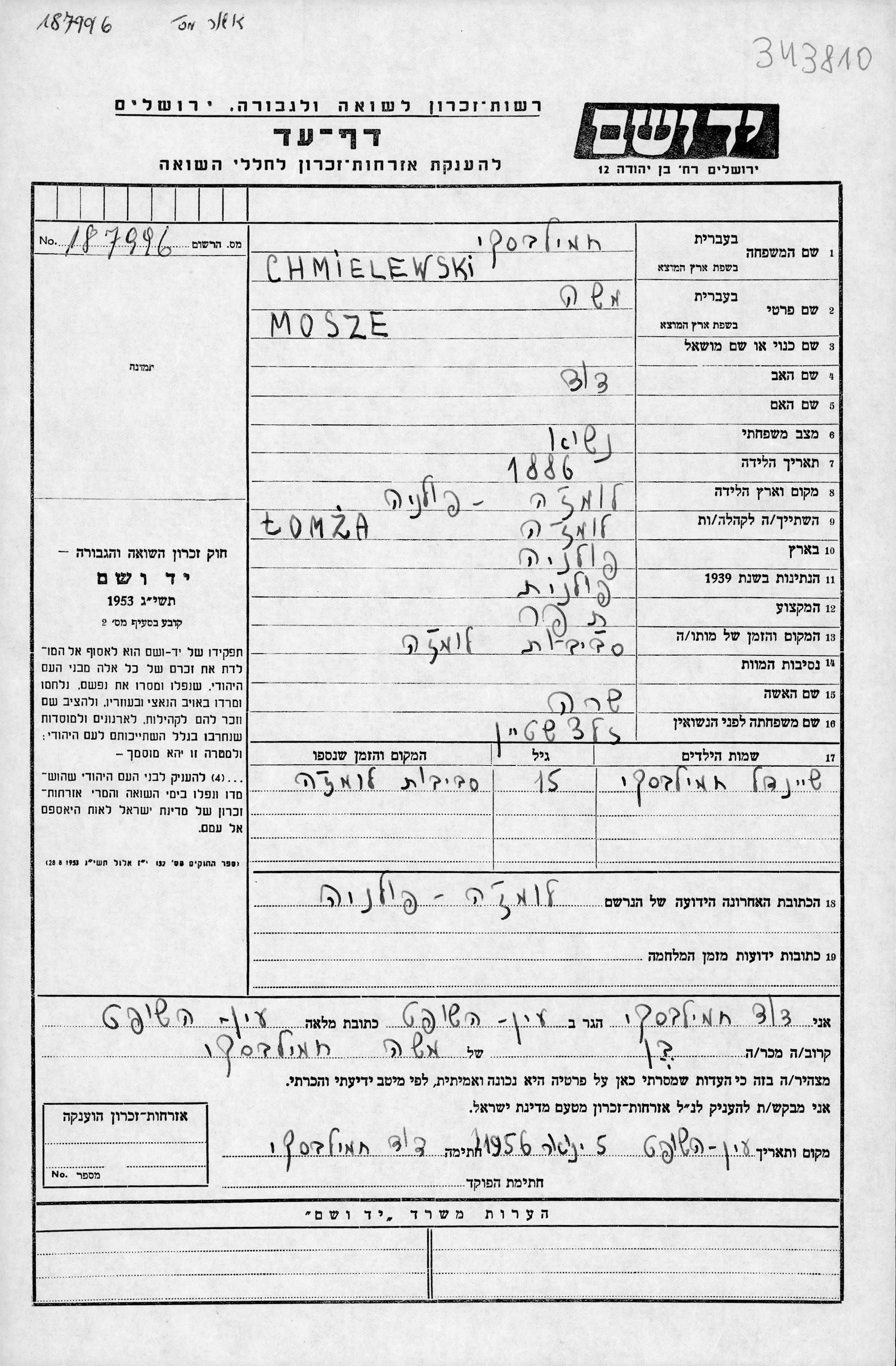 Хмилевски Моше 1886 Ломжа, Польша Лист свидетельских показаний